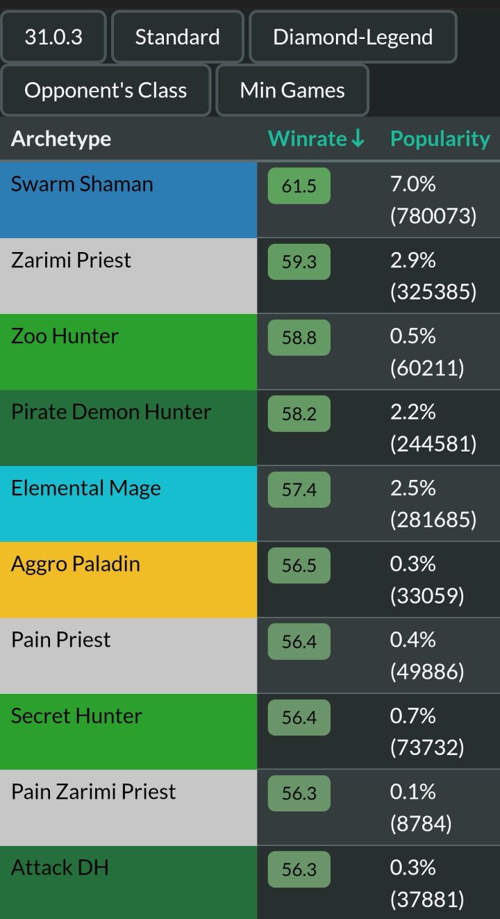 1.目前天梯霸主-海盗萨,对阵不同职业胜率-战士最低52%,但是很少看到,关键最低也是52%;