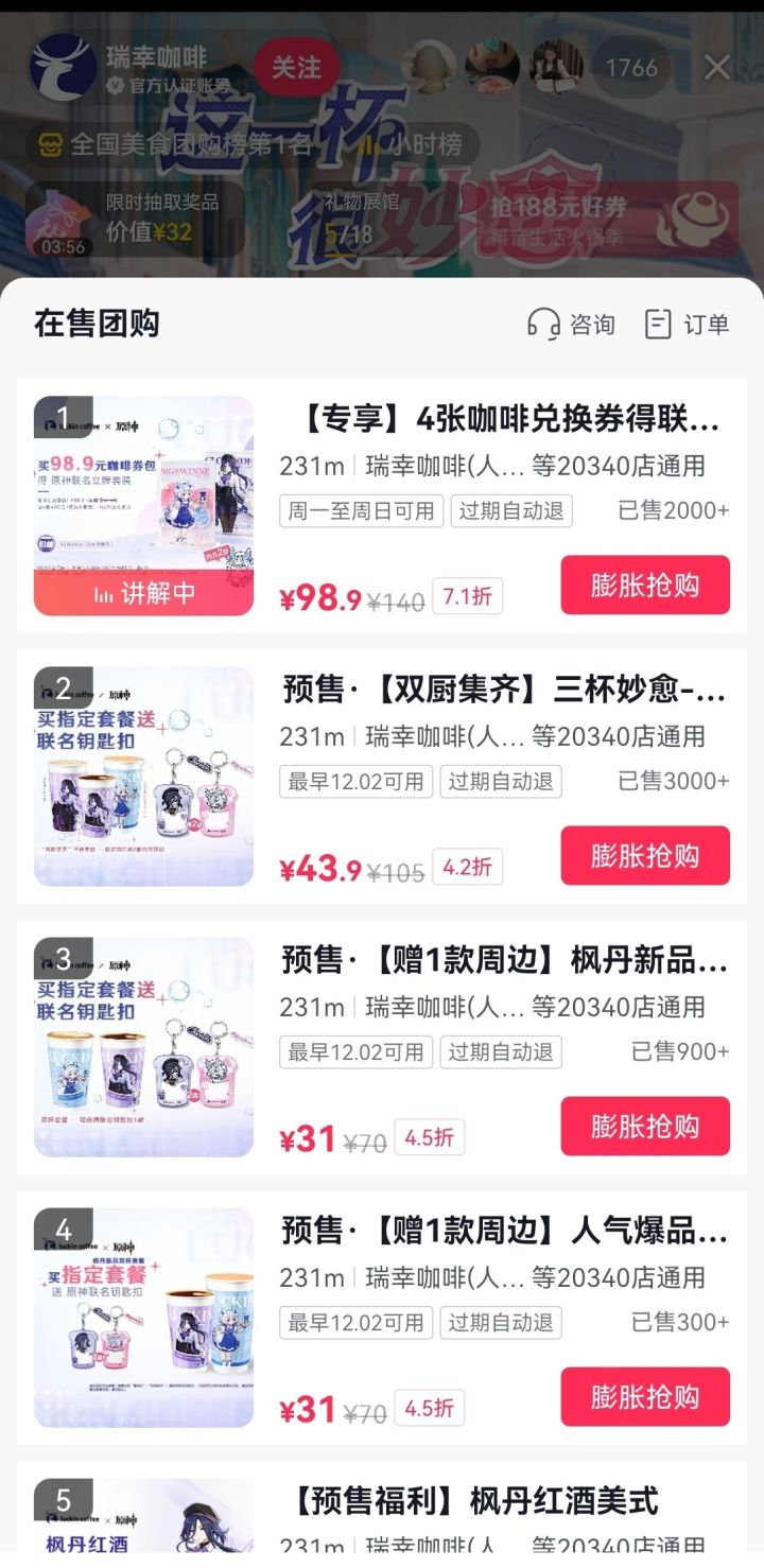 2024年12月1日,原神与瑞幸咖啡联动的产品在抖音直播内开启了预售,感兴趣的旅行者可以抓紧时间下单购买,不同的商品链接能获取的游戏周边也有所不同,建议按照自己的需求与喜好选择~