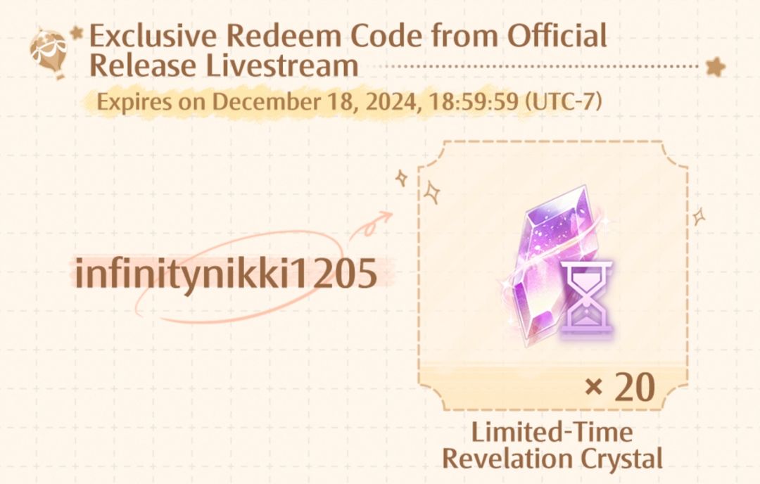 infinitynikki1205(奖励内容:限时启示水晶×20,兑换截止时间:2024.12.19 09:59)