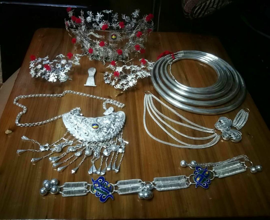 部件:银花帽、小饰品、银颈圈(侗家多为五重,很重)、衣饰(挂在衣服上的)、银挂牌(也是必不可少的装饰)、还有银镯子(我这边不是那种细镯子。又粗又大,重,还要一只手戴两个)