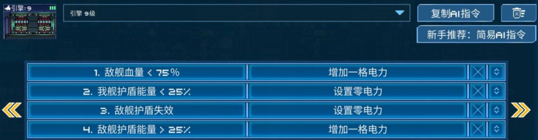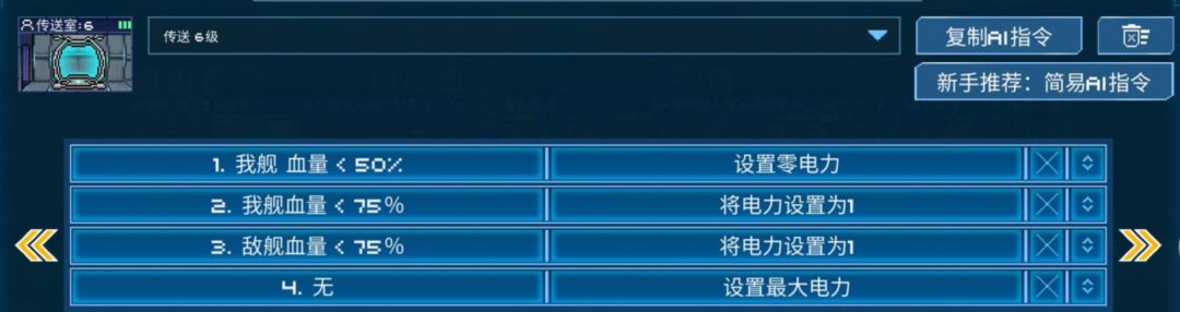 3:补救阶段:当然会出现对方小人实力过高,强拆护盾失败,或者对方火力很猛,很快把我方打开窗的情况,这时如果我们还卡在第1阶段,就会导致输出闲置,电力浪费的情况,所以我们要设置当我方护盾<25%时引擎断电,武器房通电,当我方战舰血量低于75%时,传送室断电,将电力全部匀给武器房,全力对拼输出,在劣势中寻得一线生机。