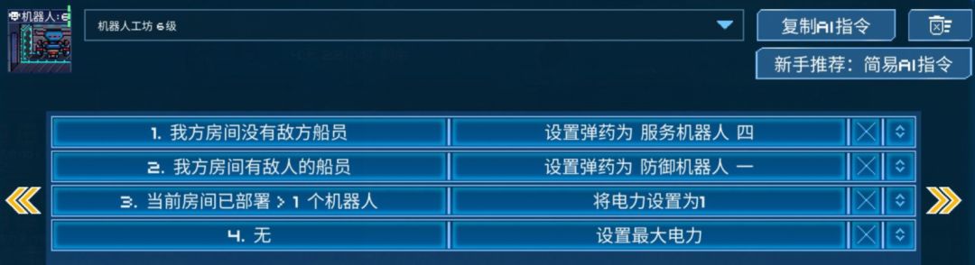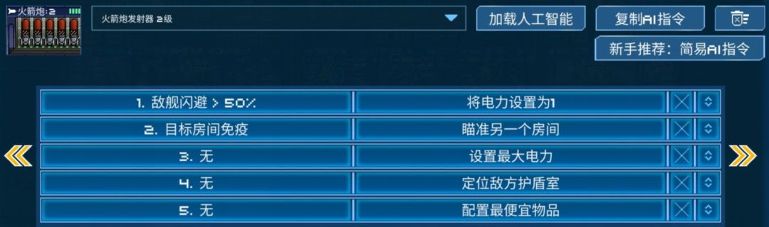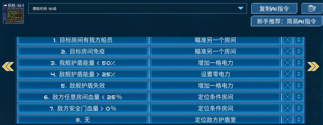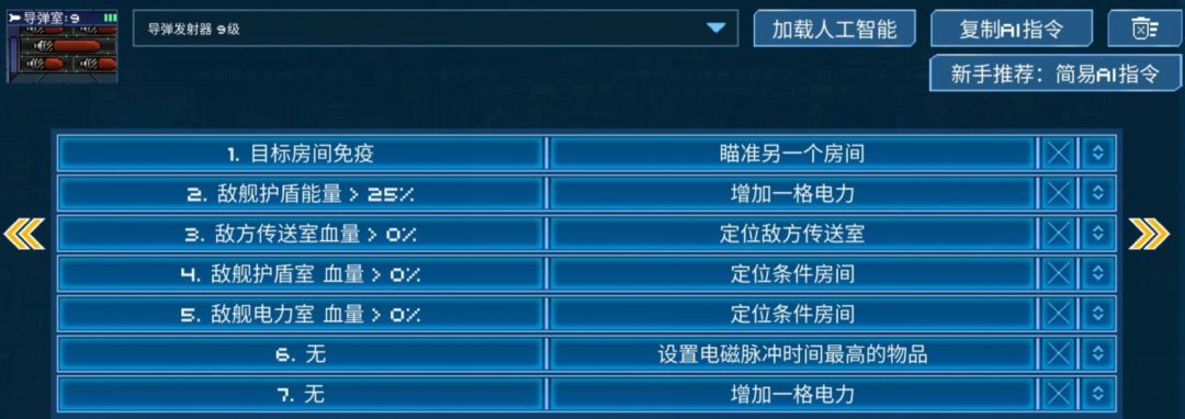这样的ai可以满足开局断电,破盾后上电,以及被破盾后上电的需求,如果希望主c镭射炮优先上电,可以把它的第四、六条改为护盾能量更高时就增加电力。通常武器室集火的目标尽量远离护盾室,因为开局秒拆护盾室,敌方跑修一定会去护盾室集合,那么此时找敌方电力室集火将会非常方便,所以护盾室破了之后,跳帮小人的下一目标一定是电力室。集火电力室的另一好处是因为跑修小人一下子修不满,所以会一直站着修,这样可以更快消耗跑修小人血量,另一个极端就是打安全门,因为只有一格血,所以可以在两次维修的间隔中对船体造成大量伤害。