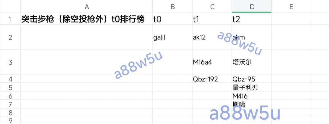 其实塔沃尔也可以算t1.5的,但是他卡的刚刚好,其他枪械要么强的很强,要么弱的很弱,单独开一栏出来有点多余。但是galil封神t0突击步枪应该没有人可以开喷吧?
