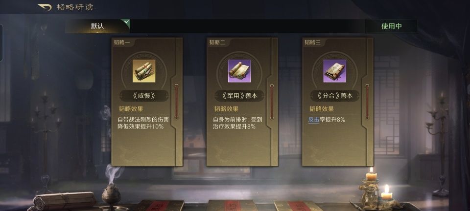 司马懿战法:鹰视狼顾+王佐之才+五雷轰顶。韬略库:后机善本+三听善本+大略(专属)。剑盾兵特性不屈,专精点亮百战百胜。