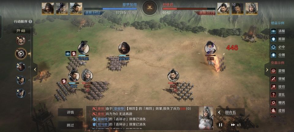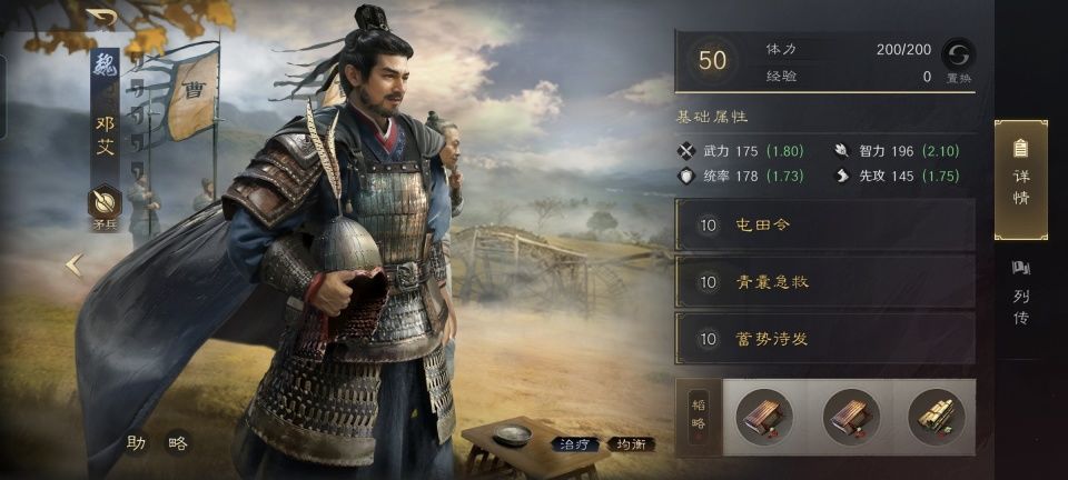 邓艾战法:屯田令+青囊急救+蓄势待发。韬略库:互势善本+兵教善本+济河论(专属)。矛兵特性鏖战,专精点亮坚定不移。站位方面,夏侯惇在前排,司马懿和邓艾在后排。总体思路来说,算得上中规中矩,亮点不在自身,却在对面的庞统。