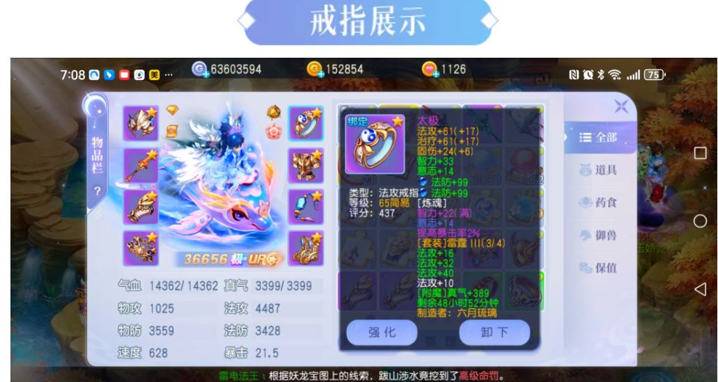 基础属性:戒指的法攻加61,接近全满属性62,已经非常完美!这样的属性加成能大幅提升法系职业的输出。