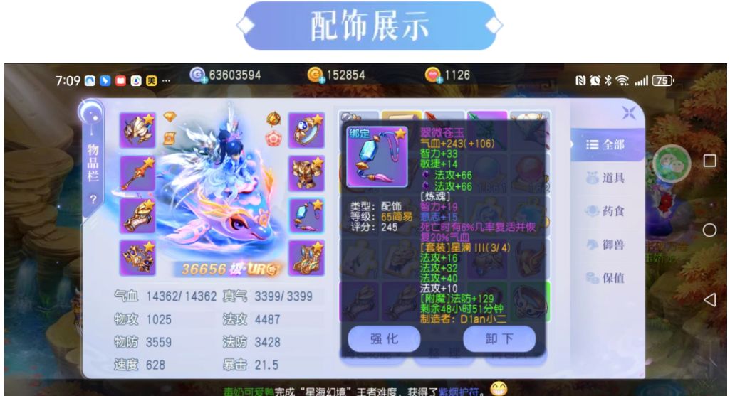 基础属性:配饰提供气血加243,距离全满仅差5点,基础属性非常优秀,提升了角色的生存能力。