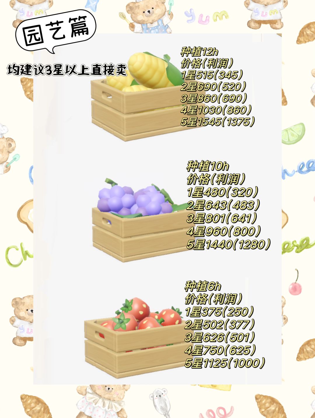 农作物主要种玉米,葡萄,草莓就行了,1.2星送去做料理,星及以上直接卖哦