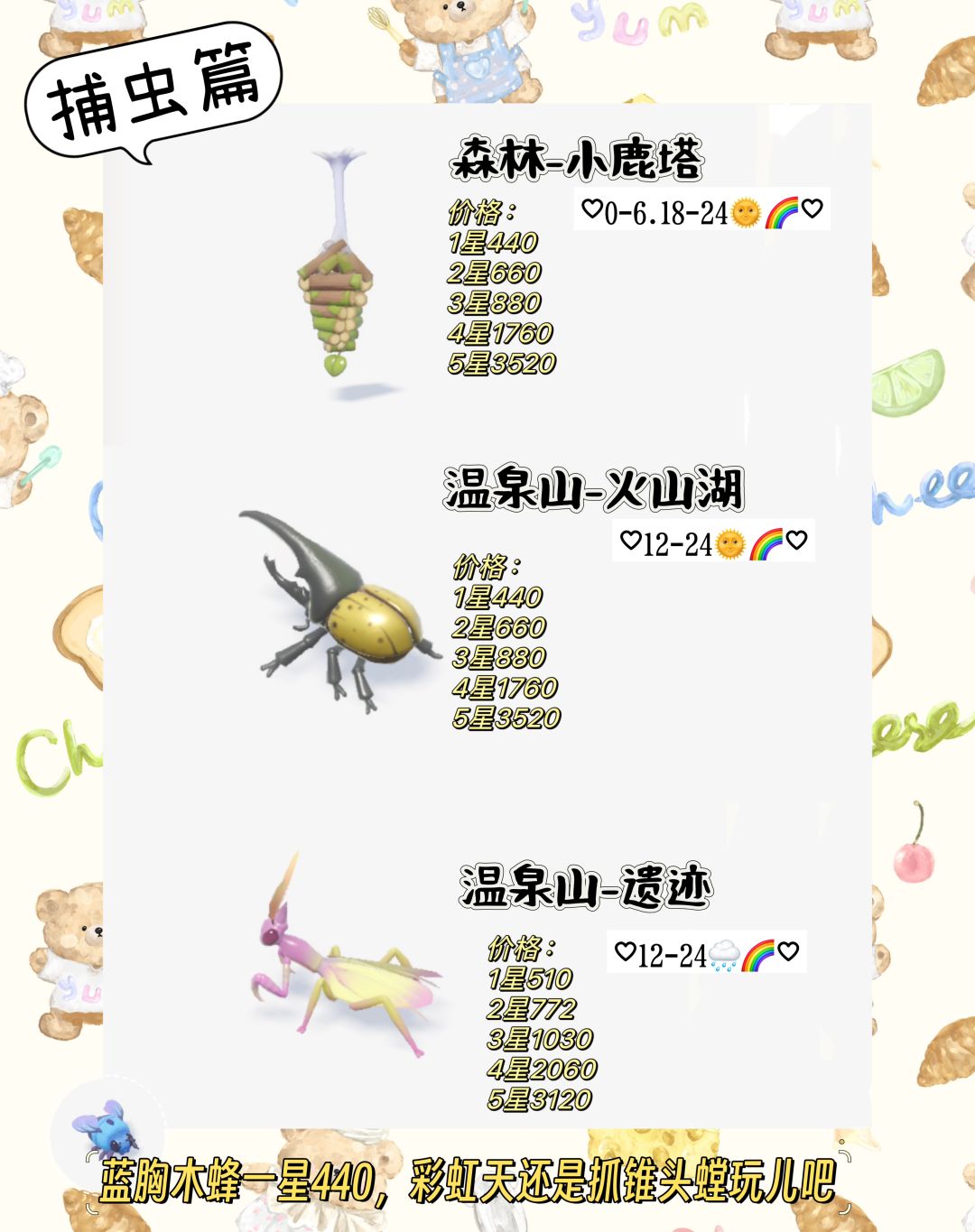 最值钱的虫子是锥头螳,一星515可惜他只有雨天彩虹天有,然后是10级的螺纹蓑蛾,长戟大兜虫一星440,所以平日刷10星虫,雨天彩虹天虫锥头螳就行咯