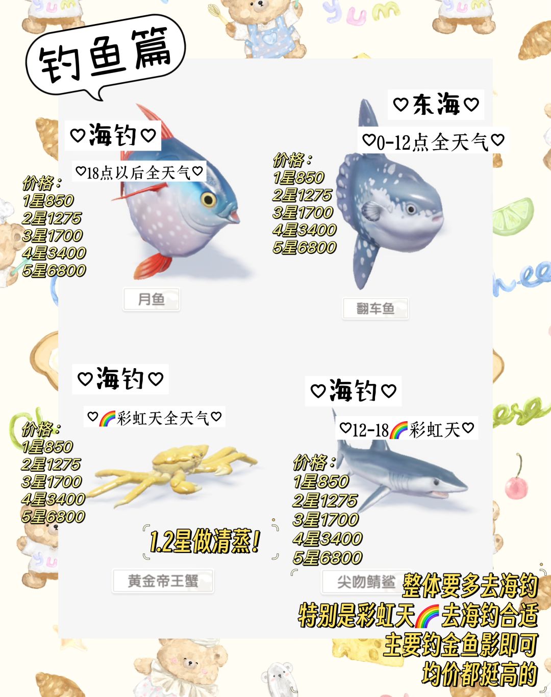 9.10级以上的海钓金色鱼影值钱,还有翻车鱼,这些一星都是850,5星6400。所以彩虹天多去海钓,钓出来的黄金帝王蟹1.2星还能做料理,清蒸黄金平均能收益4000➕