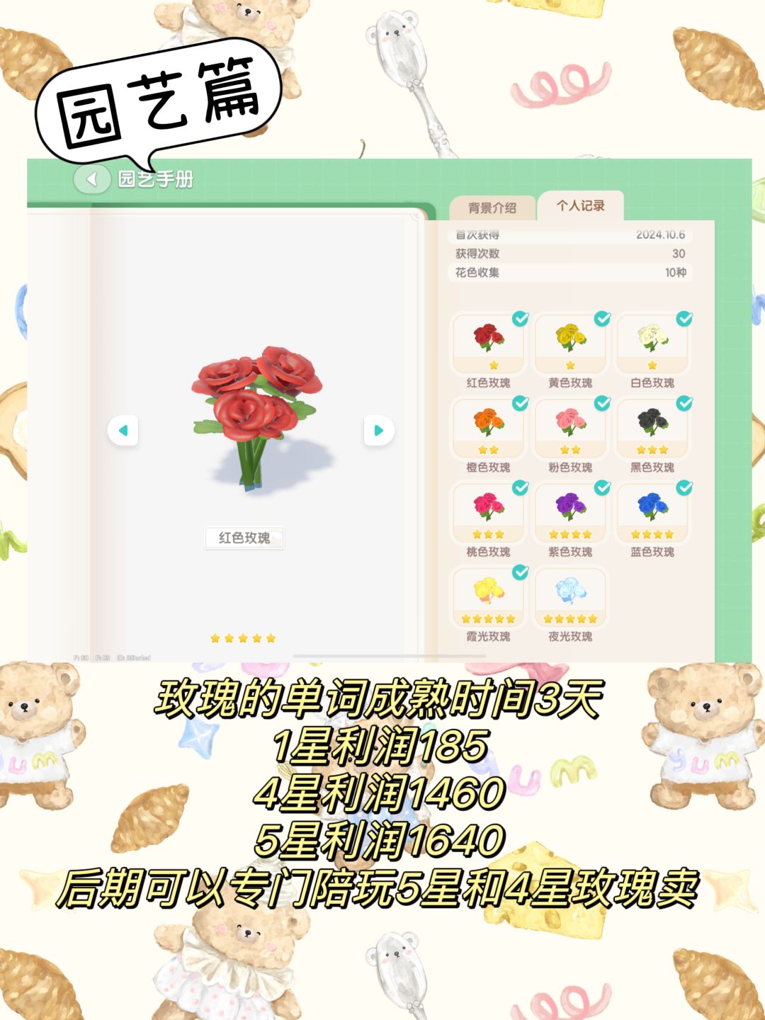 玫瑰花后期可以种4星培养大量5星和4星卖,和种植时间,价格综合算完还是玫瑰最赚!