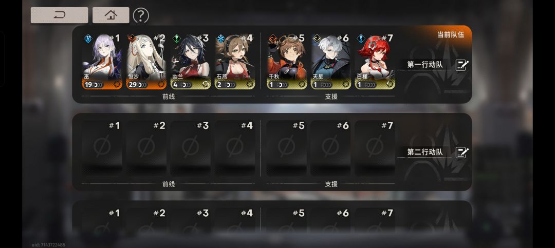 ②:因为一个行动队伍或者说一套队伍组合,是会有支援方面的增设的,主要这点工作室可以能考虑到剧情等方面的对战环节,会出现玩家做的不够细致,而致使游戏走向失败,而特意增加了持续性的补足战力,这个支援队,也是需要一定的考虑的,不能太弱于首选角色,也不能作为压轴操作,所以就需要满足即能协调首选队伍阵容和补足的类型上的不足,这点还是应按照自己账号的阵容选择,来做搭配的,如按照以上的队伍搭配,支援三个空位就要首先考虑——千秋、天星、白槿,他们拥有兼容第一首选队的替换平替输出、控制等效果,可以尽量减少失去主力队角色后,所带来的游戏失败率。