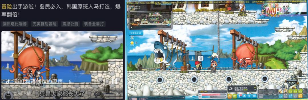 侵权买量广告(左),《冒险岛》运行画面(右)