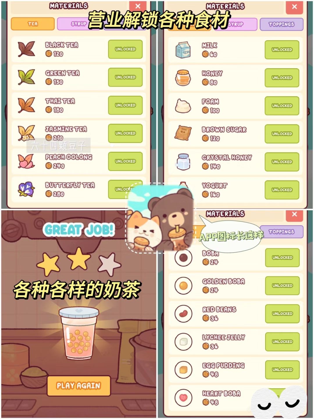 特点:制作奶茶的小游戏,制作奶茶赚金币,金币解锁茶底、小料、奶盖。