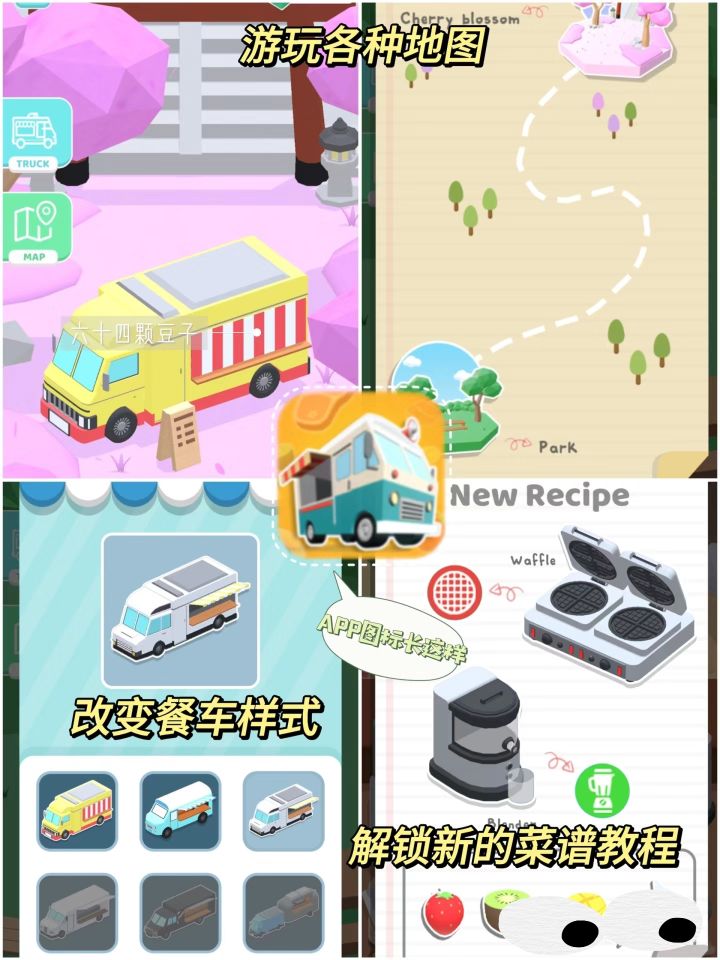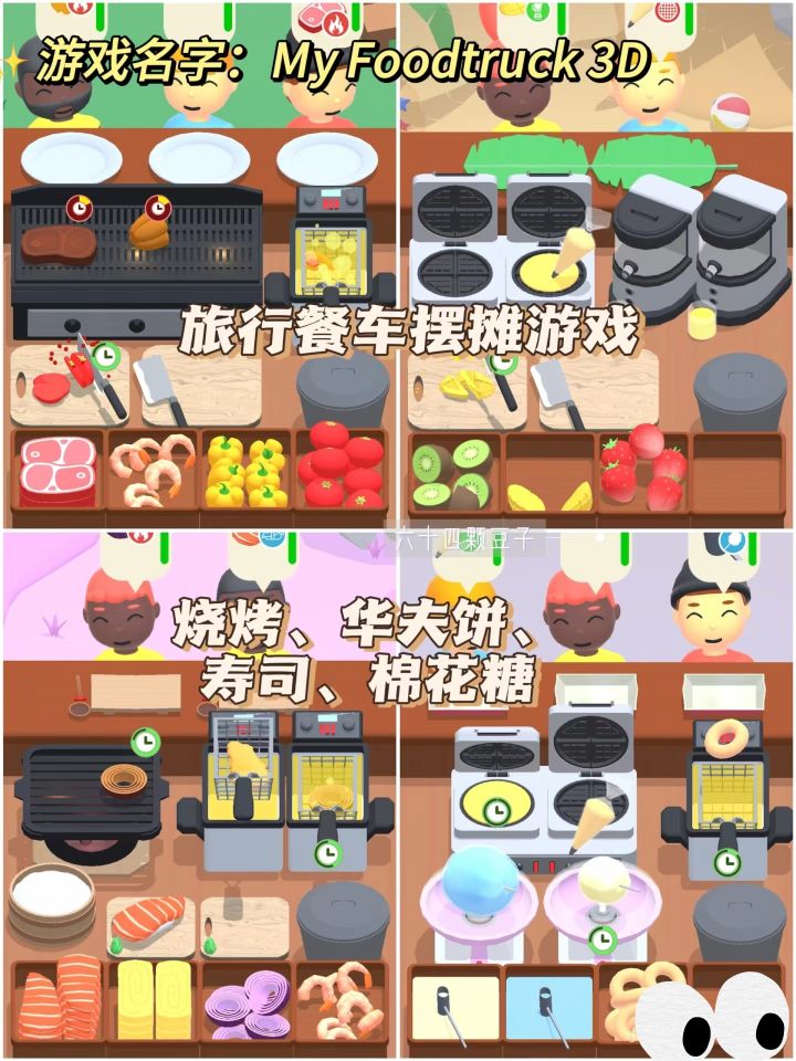 特点:一个餐车旅行烹饪游戏,总共有四个场景,可以制作烧烤、油炸、甜甜圈、果汁、棉花糖、华夫饼、新鲜蔬菜水果,玩法简单有点上头。