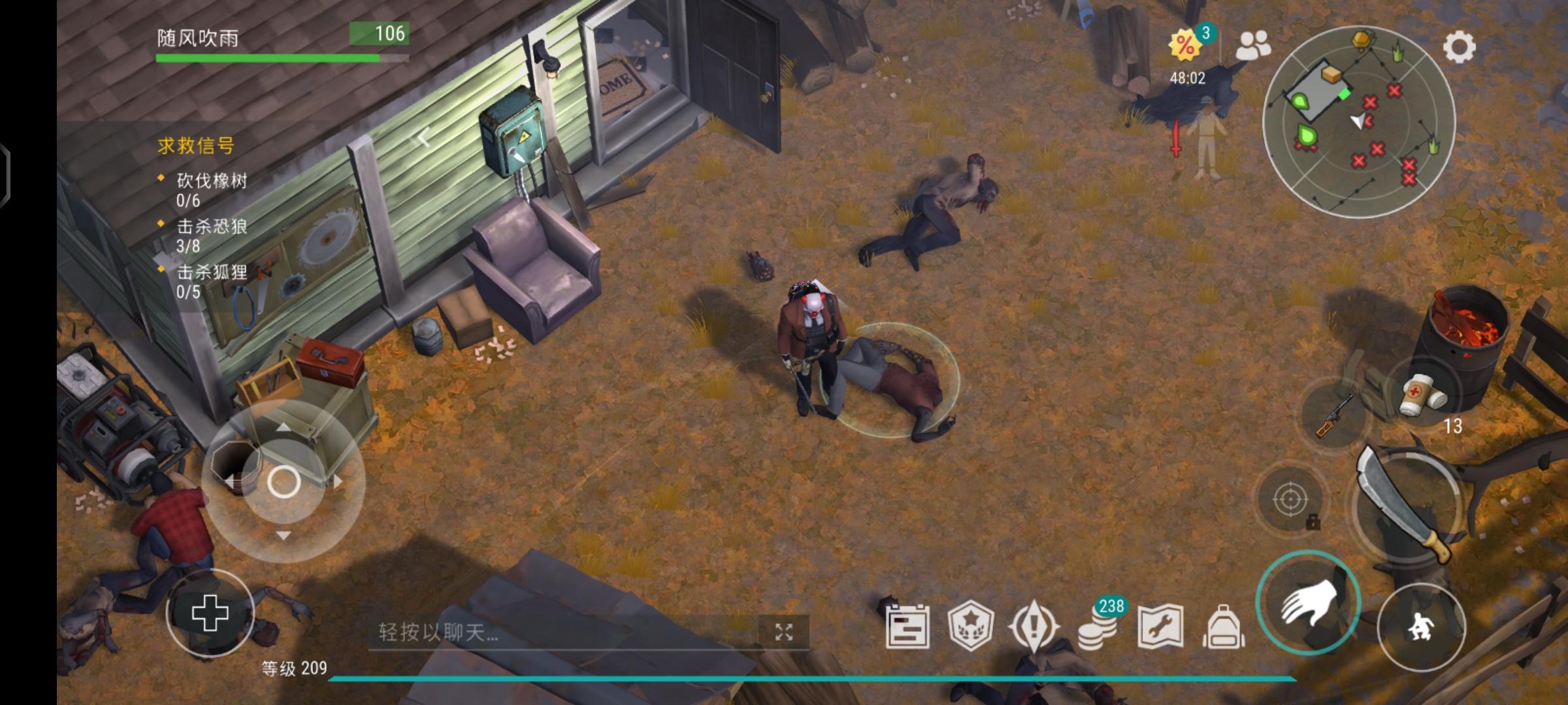 /先让去打瞭望塔有些npc和一个700血的大怪,攻速很快,我穿的军装,被轻击大概16血,护甲挺高的。记得带改装枪,我用的是半改Vss,还剩不到一半耐久。只要不做完求救信号这个任务,就可以在瞭望塔来回刷橡木,肉,皮。地图里只有60血的狼。后面任务还没做到。