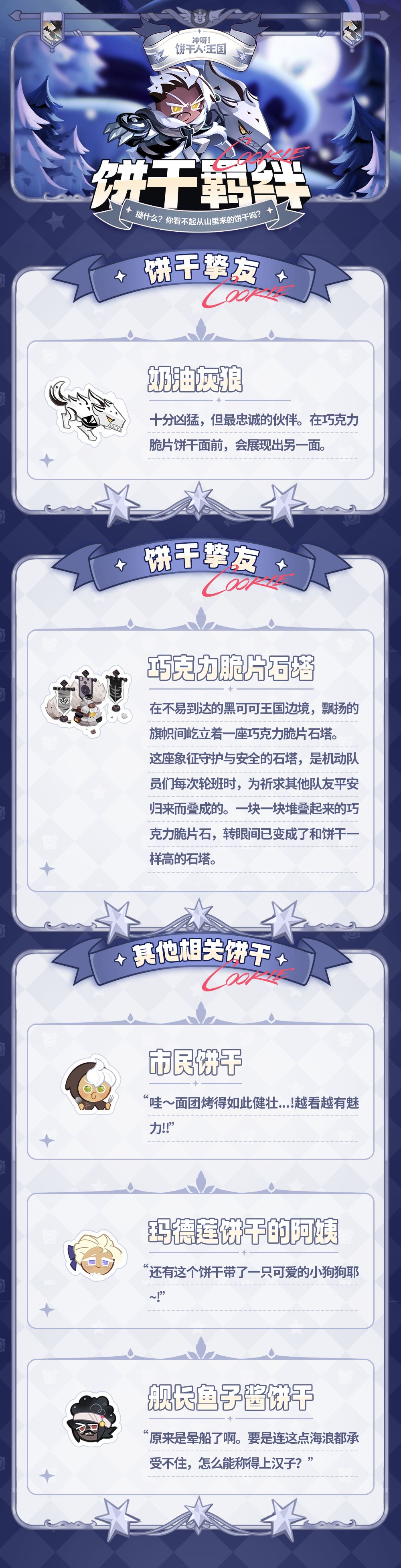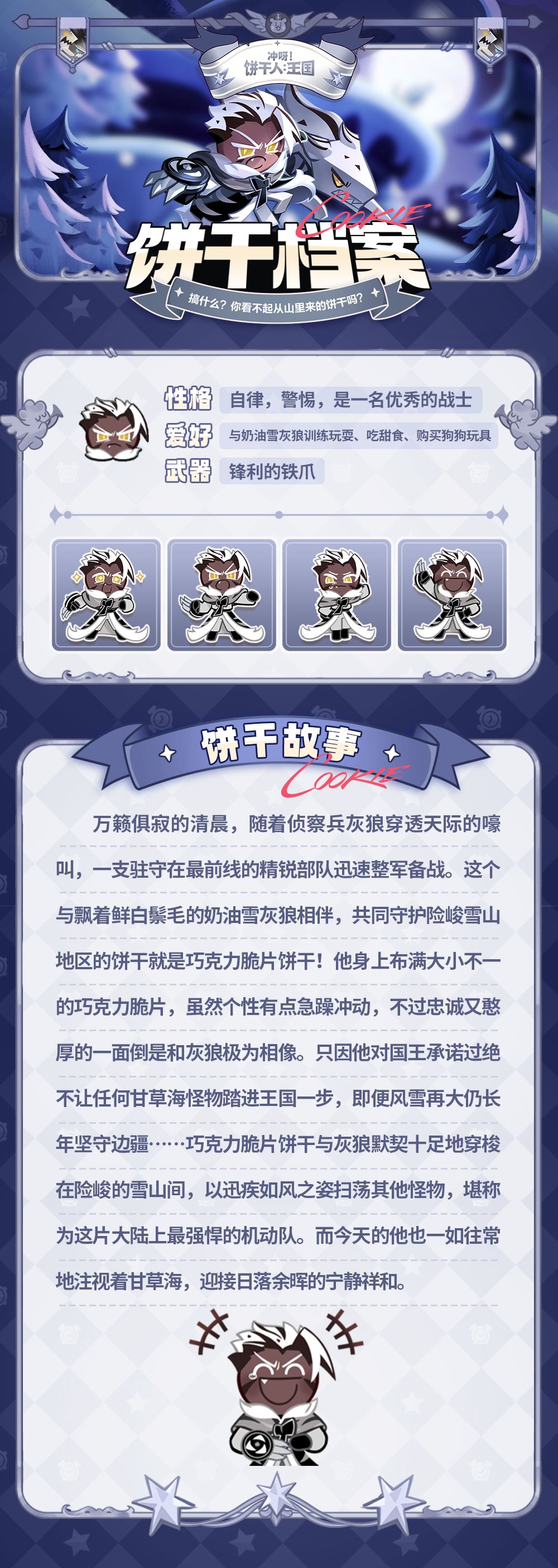 这块与飘着鲜白鬃毛的奶油雪灰狼相伴,共同守护险峻雪山地区的饼干就是巧克力脆片饼干!虽然个性有点急躁冲动,不过巧克力脆片饼干忠诚又憨厚的一面倒是和灰狼极为相像……他与灰狼默契十足地穿梭在险峻的雪山间,以迅疾如风之姿扫荡其他怪物,堪称为这片大陆上最强悍的机动队。而今天的他也一如往常地注视着甘草海,迎接日落余晖的宁静祥和。