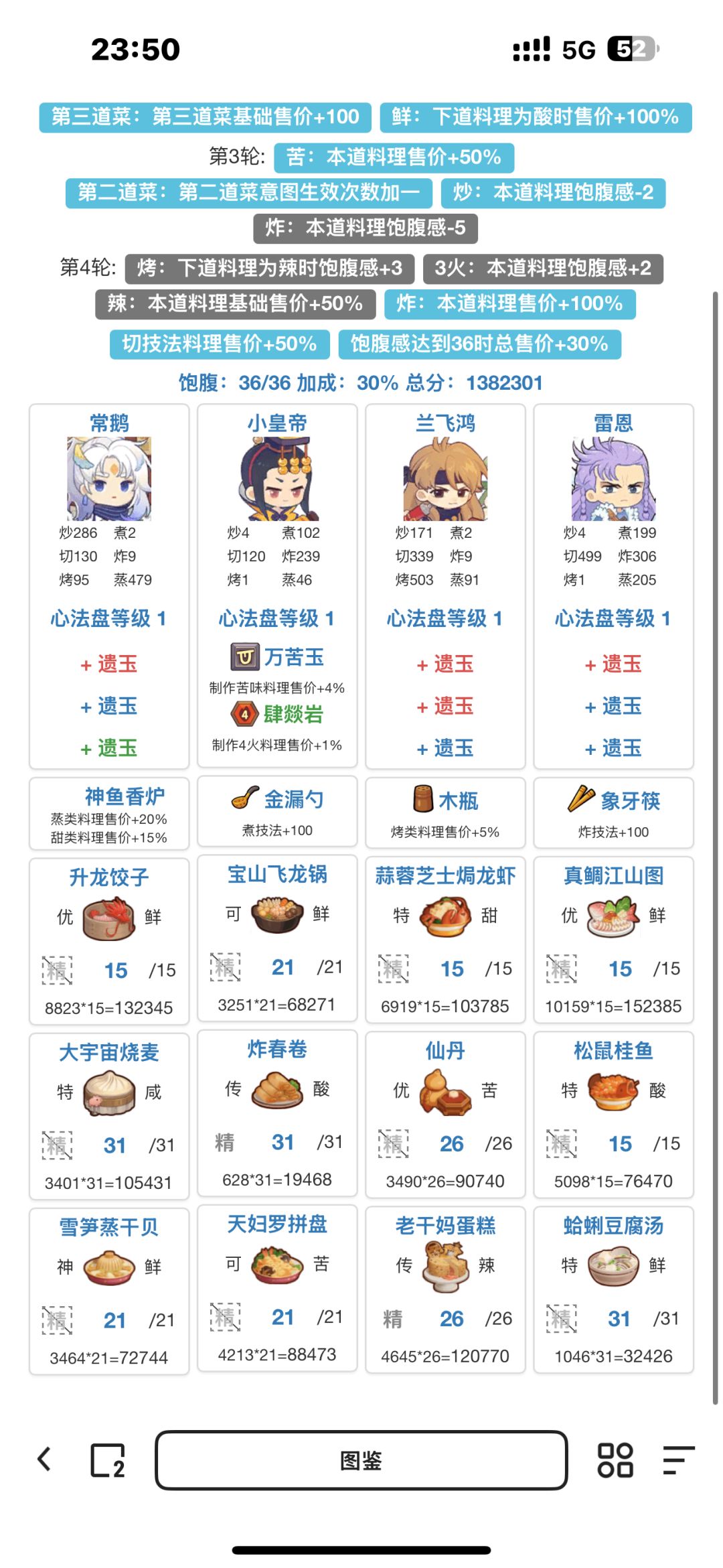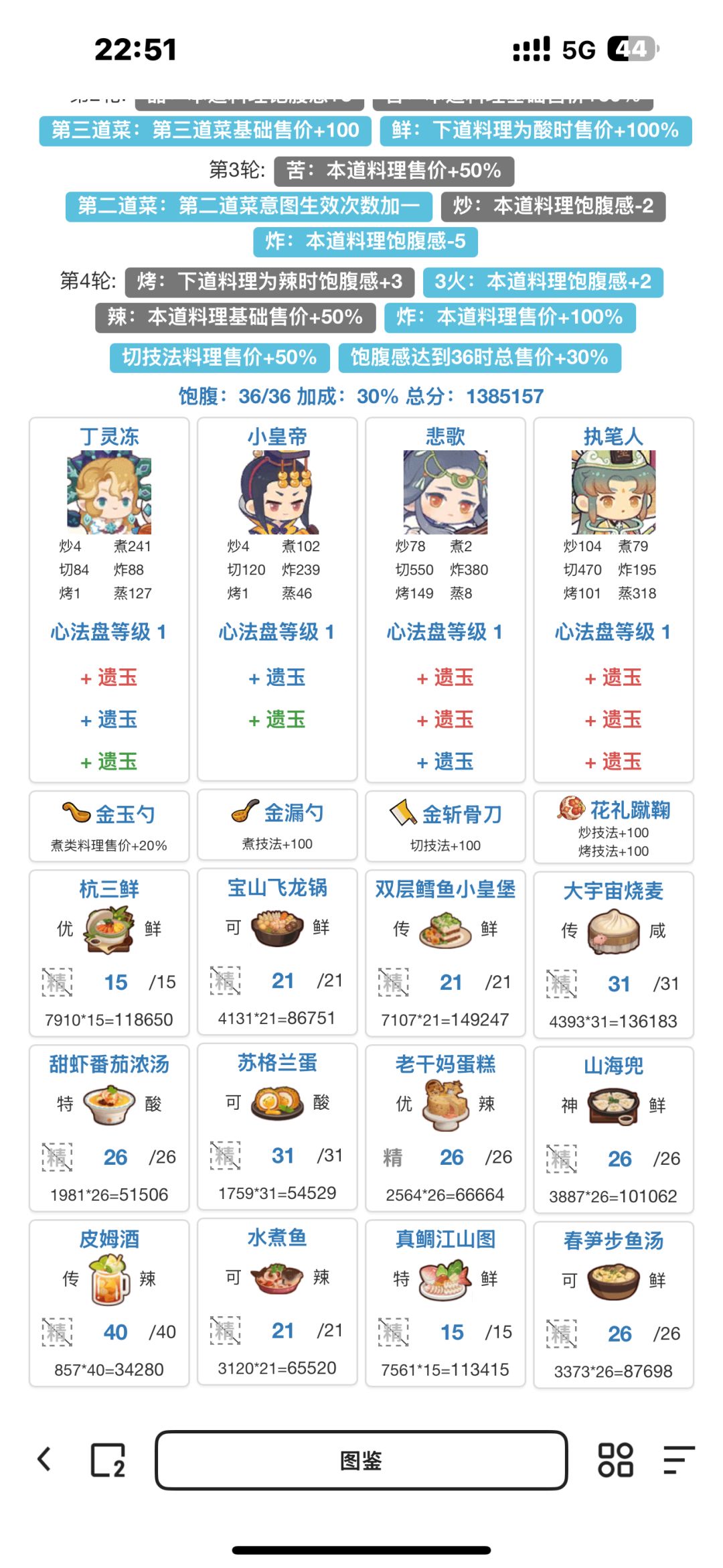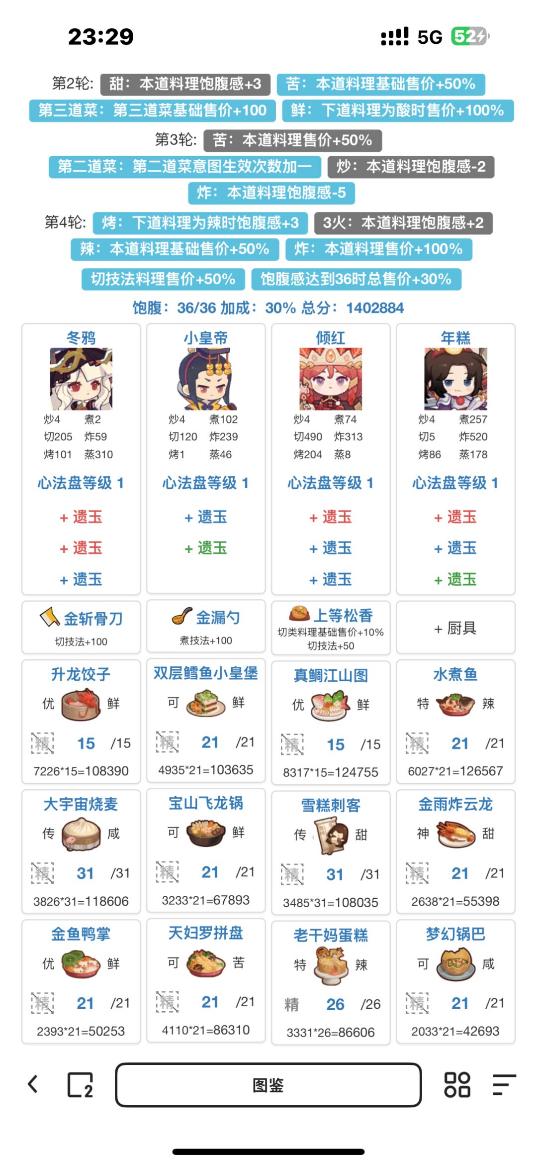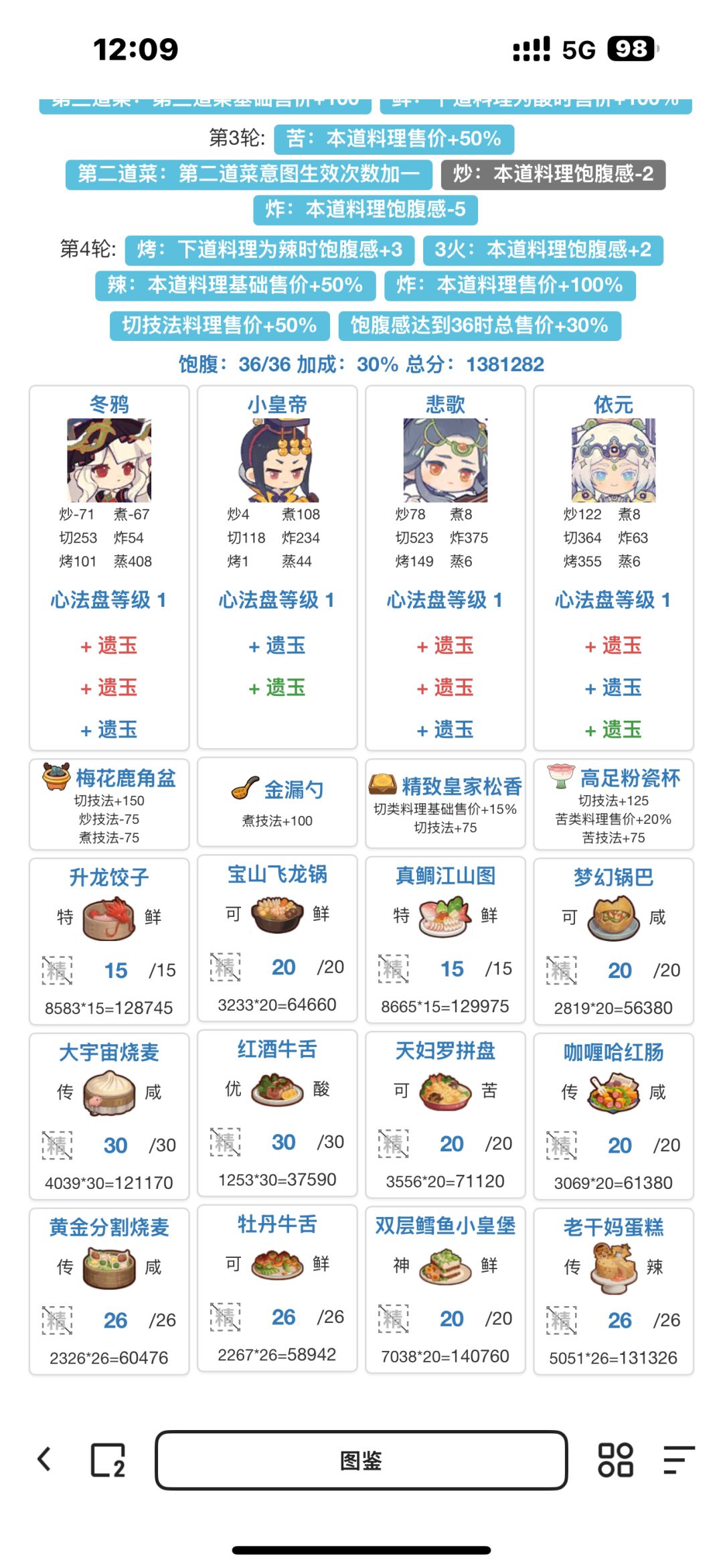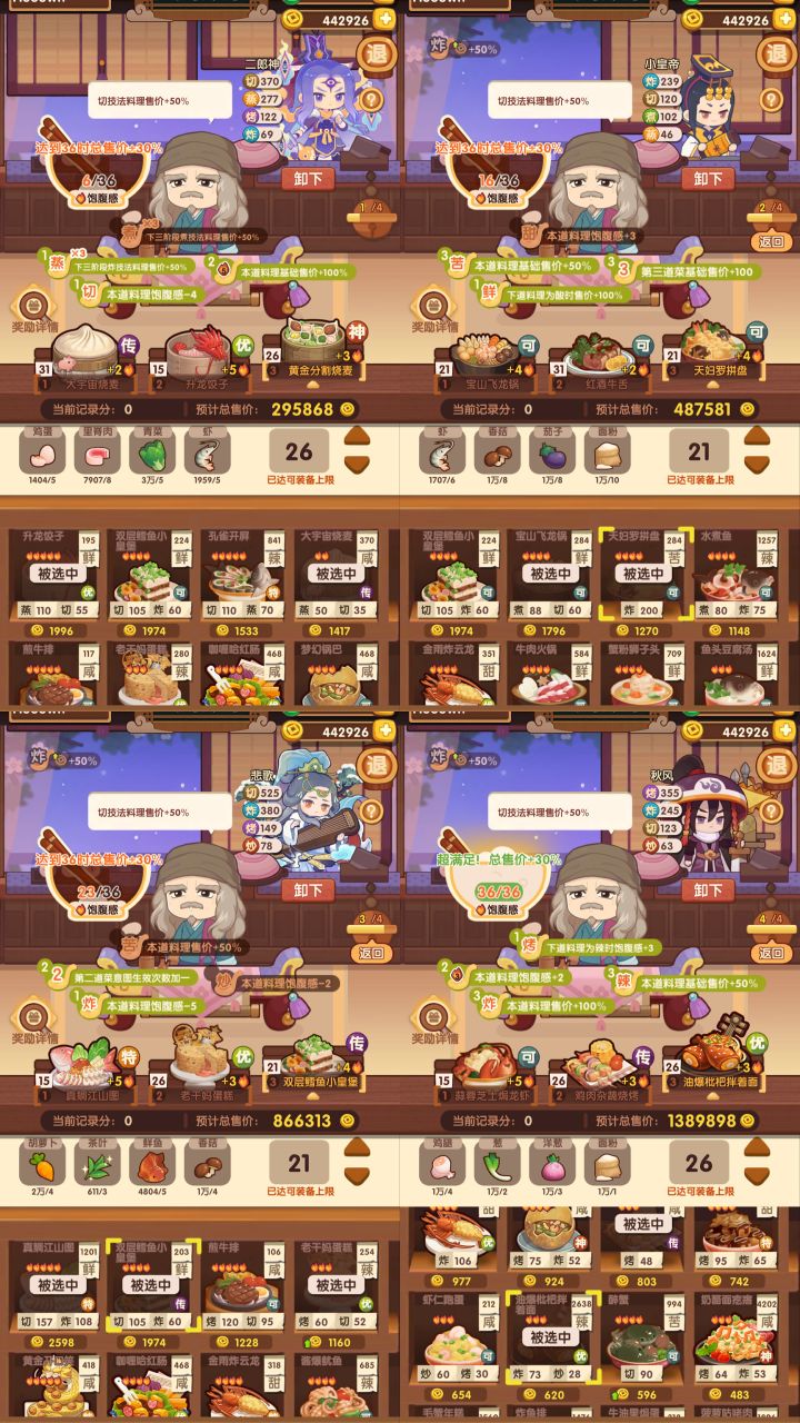 综合大佬们的思路,如果有比较多高价的蒸煮菜谱 或者煮切菜谱 可以选择双修蒸煮 或者三煮 第二轮如果要上小皇帝根据选择情况选择不一样的厨具就可以啦
