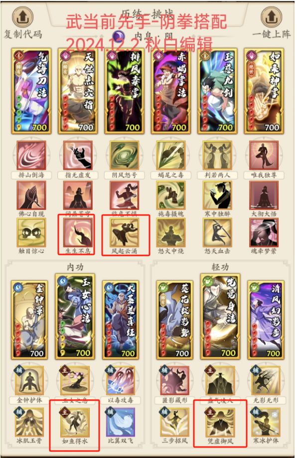 注解:阴拳重点门派之一,熬到这个阶段的阴拳有先手的玩家就算已经小成了,这阶段可选的搭配比较多,朋友们自行选择适合自己区内环境的搭配就好
