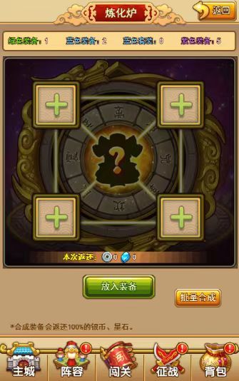 大家通过使用炼化炉合成装备,可以进行批量合成,合成装备会返还100%的银币、星石。每次可批量合成最多10件装备哦~