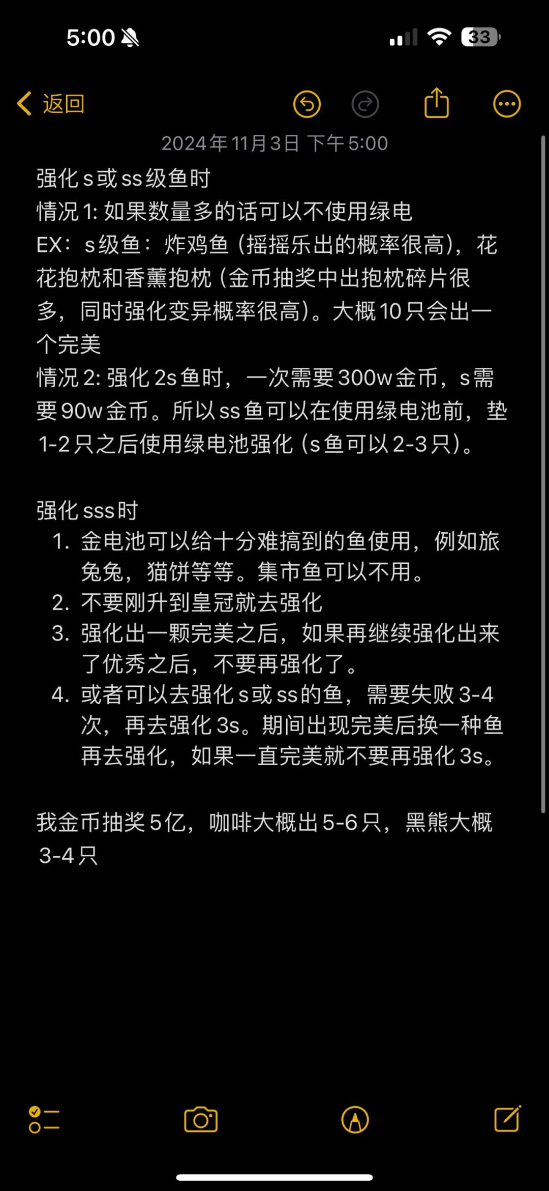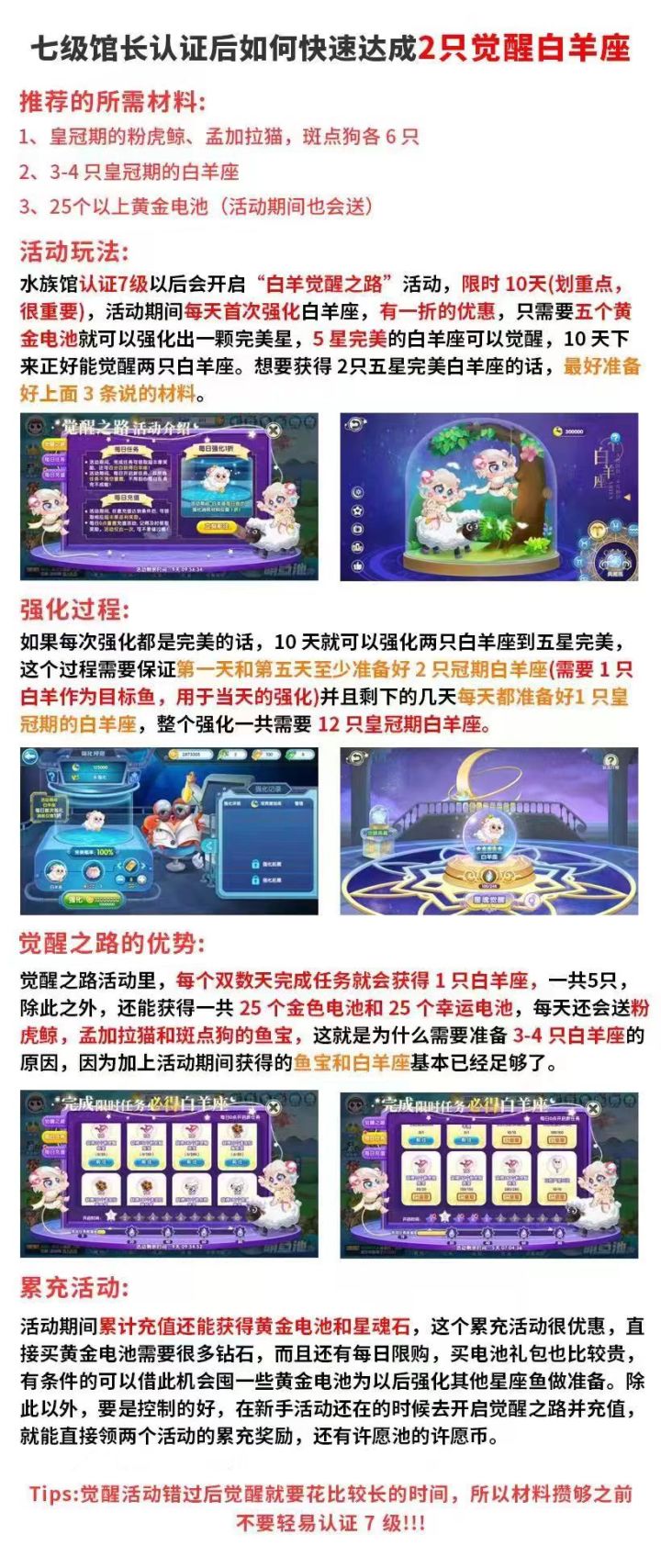 #觉醒攻略 #新手攻略 本次攻略比较多,我也懒得分开写了,一次性发出来,图一是新手7天活动前面是任务,后面是奖励。图二是新手快速获得白羊座觉醒。图三是部分鱼变异数量,并不是百分百哈,只能是说大概,上下会略有浮动,欧皇非酋不算。这些都是大佬给的,我觉得你们会用到。所以都放了。图四是强化大法。我自己总结的。我口述给小伙伴,小伙伴给我写成文字版本的,因为我实在太懒了。强化周其实分为两种:一个是折扣强化周,就是一天首次强化5折,更建议大家用金电池强化稀有物种。第二种就是电池强化周。不限制次数,更建议大家强化非sss的鱼,那么有的人会觉得平时强化失败概率太高的话,可以参照图4的3-4点进行。希望大家玩的开心哦!有疑问可以来问我哈id:728985
