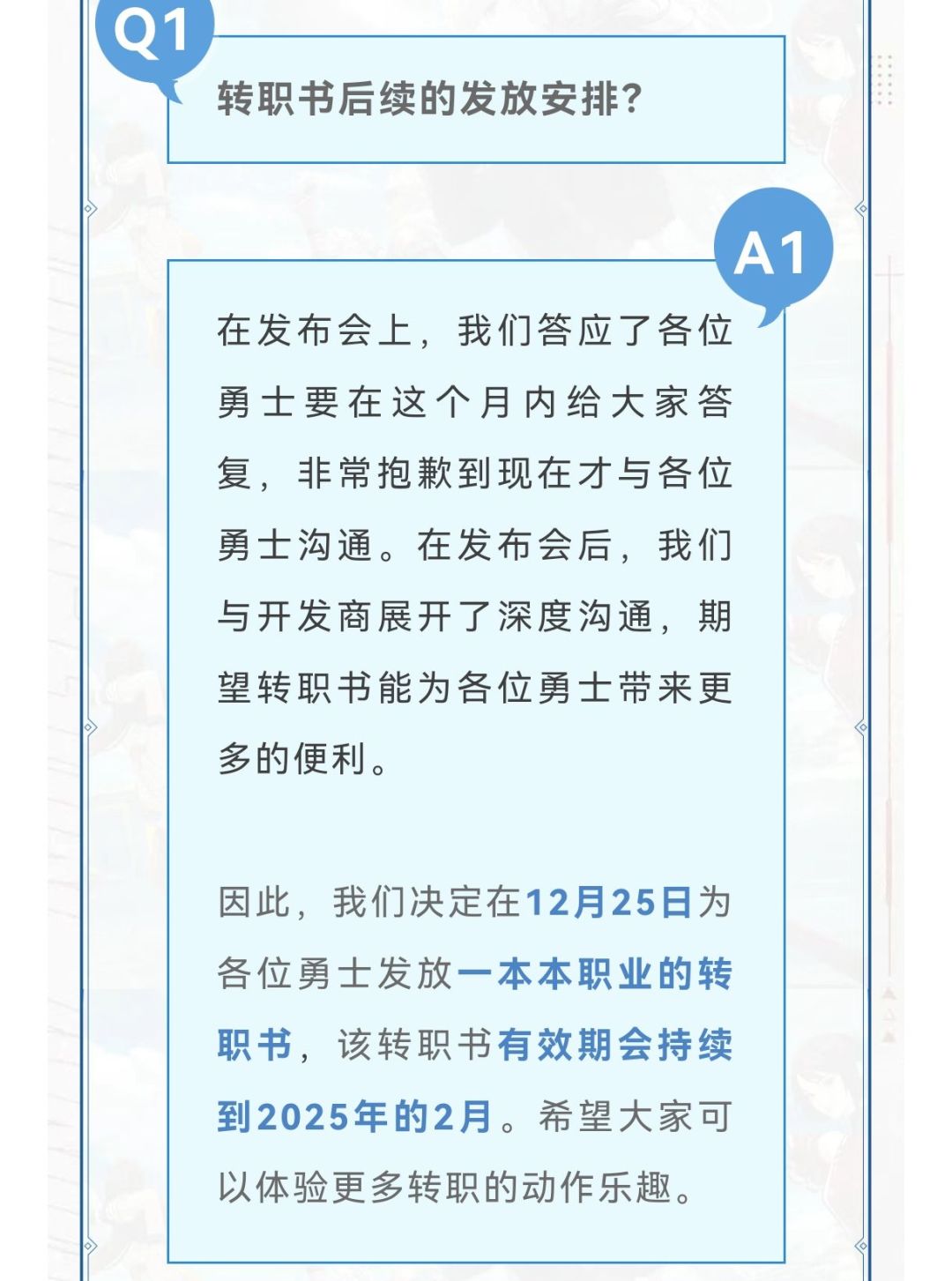 勇士们不用担心“是否会送转职券”的问题,因为现在已经确定,在12月25号,将赠送一本本职业的转职书,有效期持续到2025年2月,足够应对女圣职者满级后转职的问题!