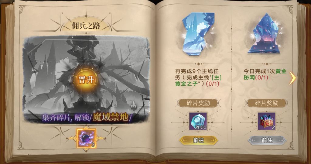勇士们在克兰蒙多冒险时期,过关斩将进入主线章节——佣兵之路,解锁对应物资和宝石的收集任务,集齐碎片后即可解锁魔域禁地。