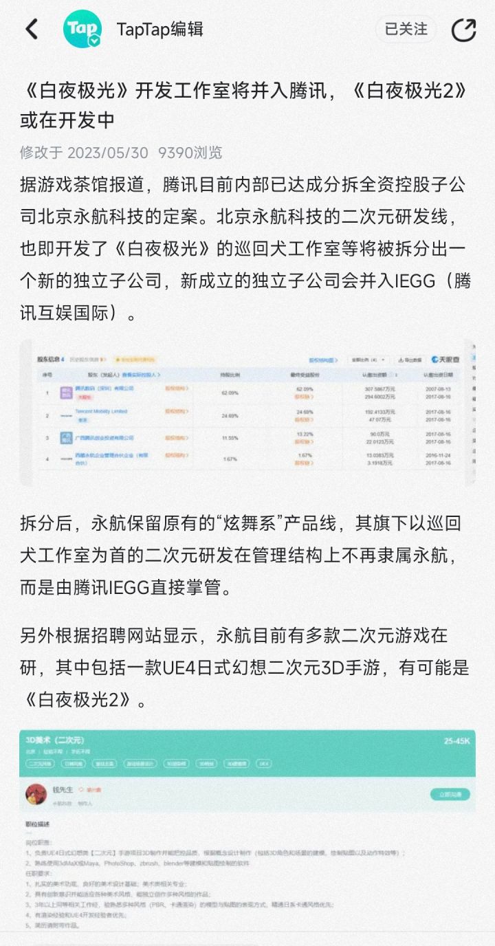 白夜极光工作室在国服公测时就已经被拆分了,巡回犬北京自己在研UE4开放世界,而永航被并入IEGG的研发团队有可能在研《白夜极光2》。