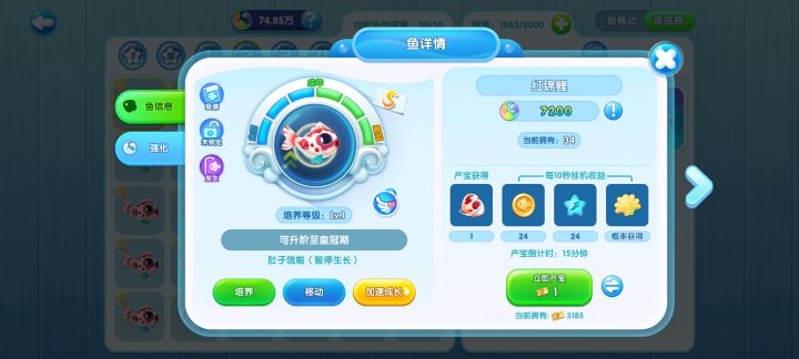 第三步:0点要赶时间不停升级所有锦鲤,因为保底也得升级20多条后,才会变辰龙,如果升级了25条还没出辰龙,可以看一下,是不是10条辰龙,全部被别人抢完了。