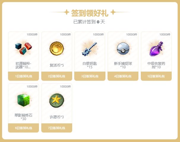第一日:初源精粹-武器*10、初源精粹-防具*10、初源精粹-饰品*10