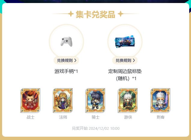 集齐【战士】、【法师】、【骑士】、【刺客】卡牌,即可兑换:游戏手柄*1;