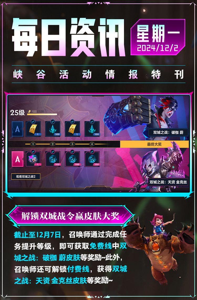 截止至12月5日,召唤师完成活动任务获取双城币,即可兑换双城之战 金克丝皮肤、双城之战 蔚皮肤、专属回城音乐《孤勇者》、皮肤姿态等好礼~