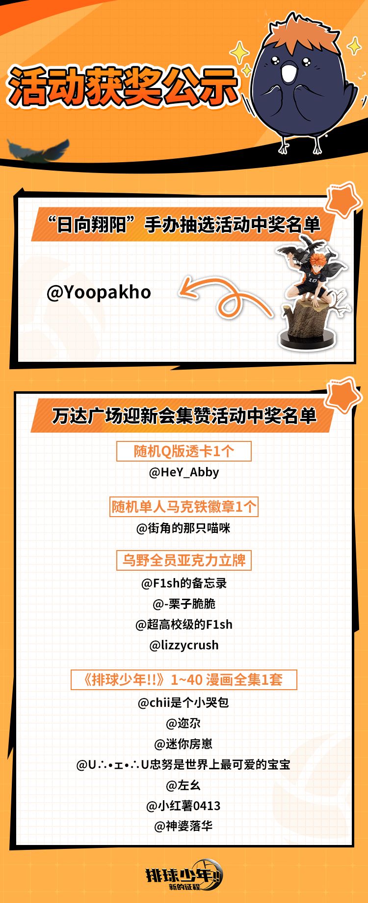 亲爱的玩家们,感谢大家热情参与“日向翔阳”手办及万达广场迎新会集赞活动!大家期待已久的日向翔阳手办周边获奖名单终于来了,让我们一起看看是哪些幸运玩家成功获奖了吧!
