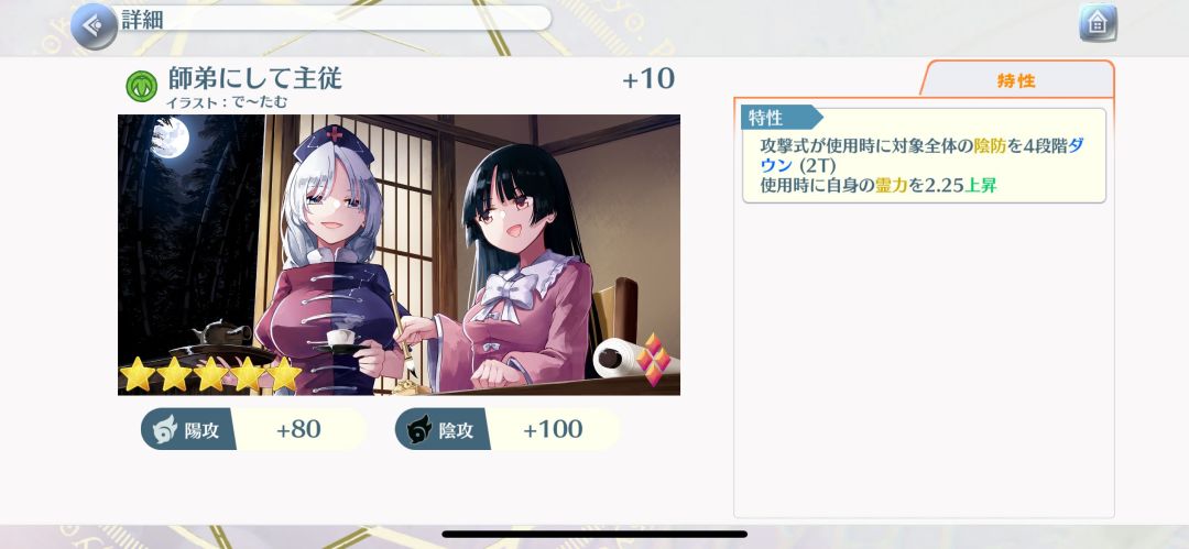 技能早苗同款根据体力百分比增伤,和结界增伤一样都是基本可以无条件吃满的类型,最高50%而且也是3T,虽然跟华扇帕琪之流的增伤没法比,但是也算是不错的数值了,