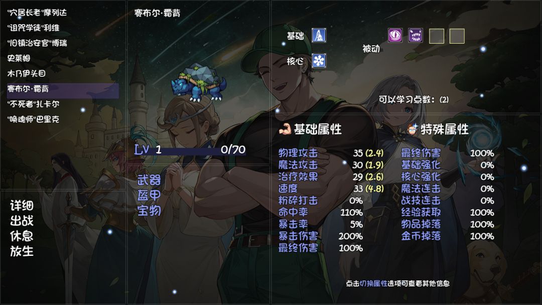 3.进入城镇后有选择npc(但是老迈演示的时候有bug,没看到),但是后续有旅人系统,可以给自己的城镇招募到有特殊效果的npc(可能是变大师球的商人,也可能是免费治疗的护士,也有像大千世界一样对话就可以给你施加特殊效果的npc,还有些是减少抽奖时间,还有每三十分钟可以获取几十万金币的npc等等,旅人也有品质和角色一样)。