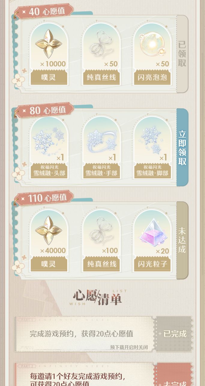 很多小宝都不知道官网预约可以拿到奖励!邀请的好友【不能在官网下载过】!我已经满了就不发链接了,入口可以在无限暖暖官网找!邀请三个好友就够了,后面下载游戏还能有15心愿,加上去就可以获得所有奖励!