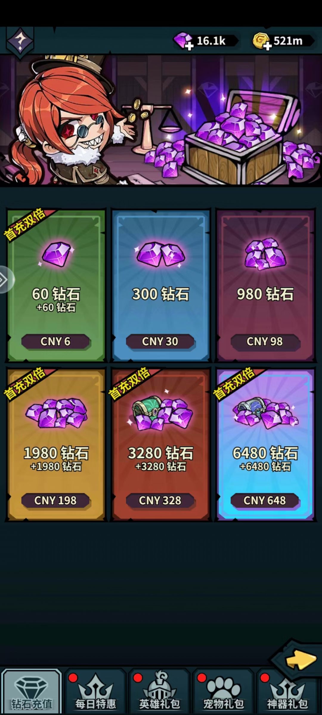 充值钻石(碰都不碰,看都不看。大佬随意,就首次双倍,不如搞活动)