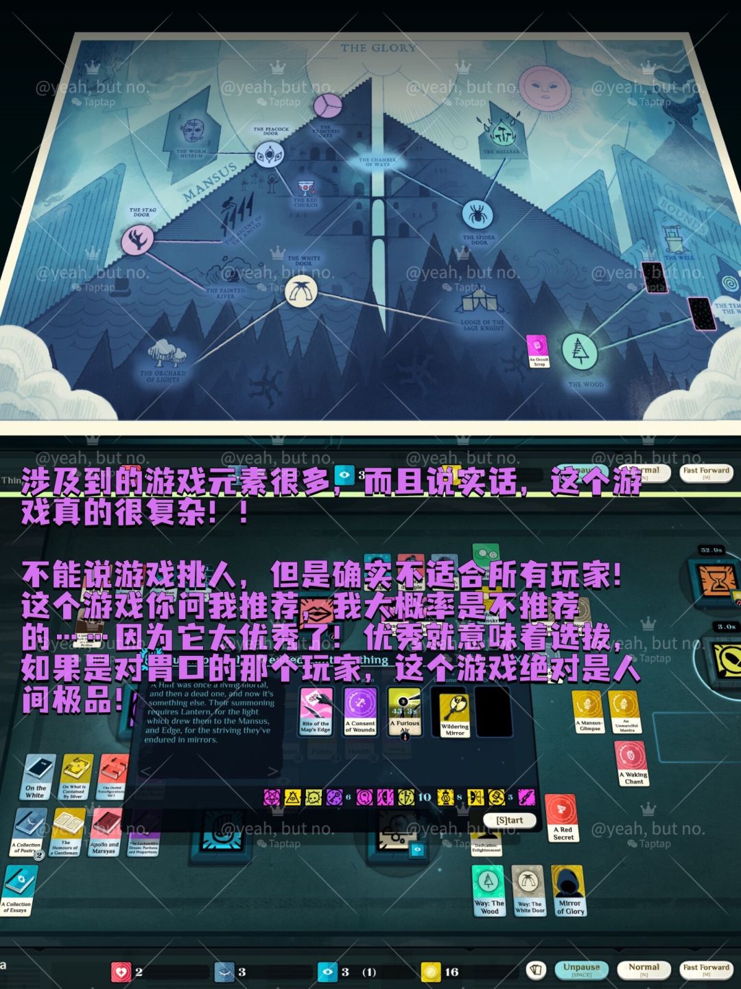 看起来特别高端对吗?但是总结成一句话就是:极高成本的,试错游戏!!甚至你前5小时都不知道自己在干嘛!![[TapFamily_溜了]](https://img-tc.tapimg.com/market/images/173253540ac2bec44d6f62a7279f5a28.gif)