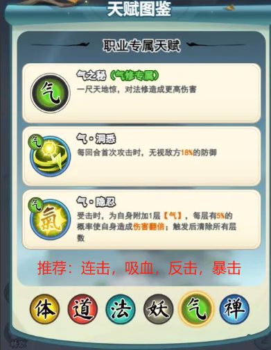 5.气修首次攻击忽略敌方部分防御。受击有概率使自身造成的伤害翻倍,触发后效果消失。克制法修,忽视防御、伤害翻倍,推荐堆加攻击,暴击,连击等属性(推荐:连击,吸血,反击,暴击)