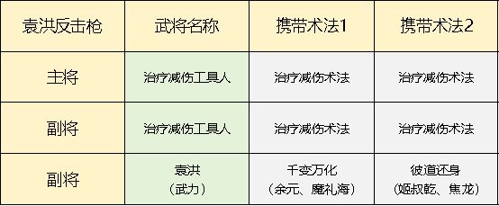 队伍搭配思路:赋予袁洪反击效果,剩下的武将和术法,选择坦度、治疗、暴走控制这三大肉队标配效果的搭配思路。
