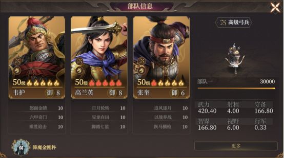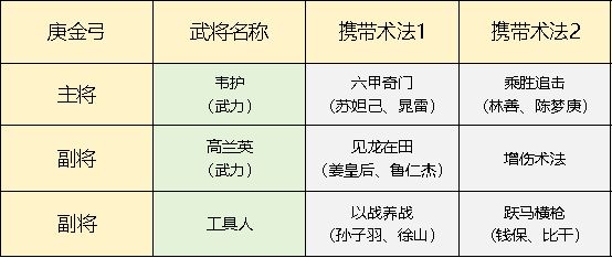 队伍搭配思路就是:高兰英叠加庚金层数,韦护打爆发庚金的伤害,剩下的一个作为工具人,可以选择增伤的辅助武将,也可以选择叠加庚金的武将。