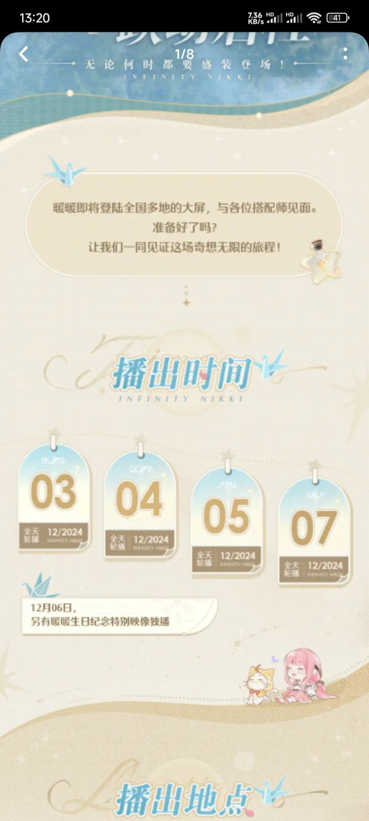 (官方账号可查询)各大城市广场12月3~7日循环播放无限暖暖宣传/12月6日有暖暖生日特别映像独映