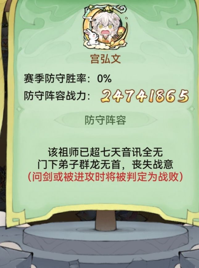 离线久了就会出现不用战斗就输掉比的情况,被进攻或则问剑时将被判定为战败。