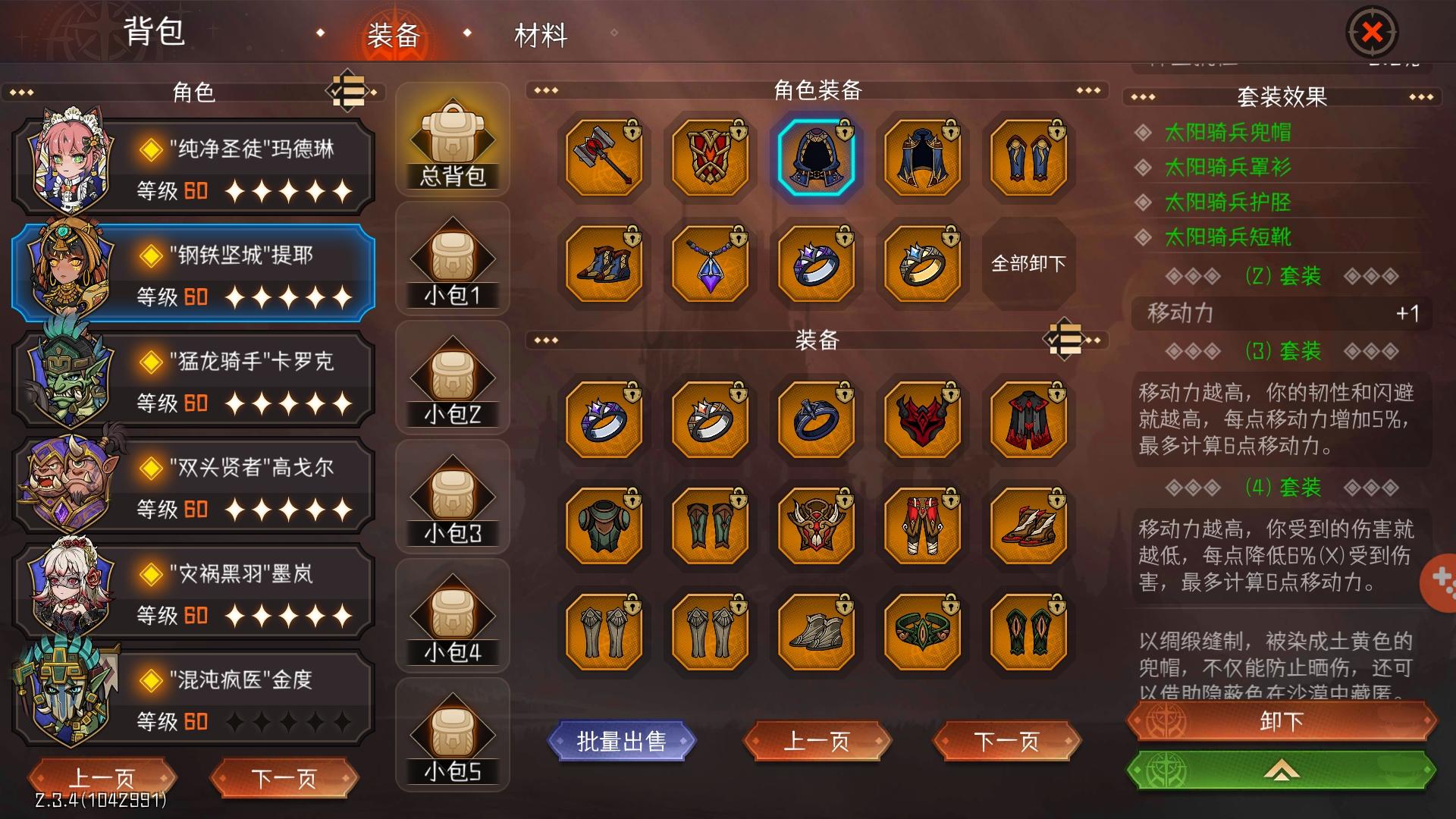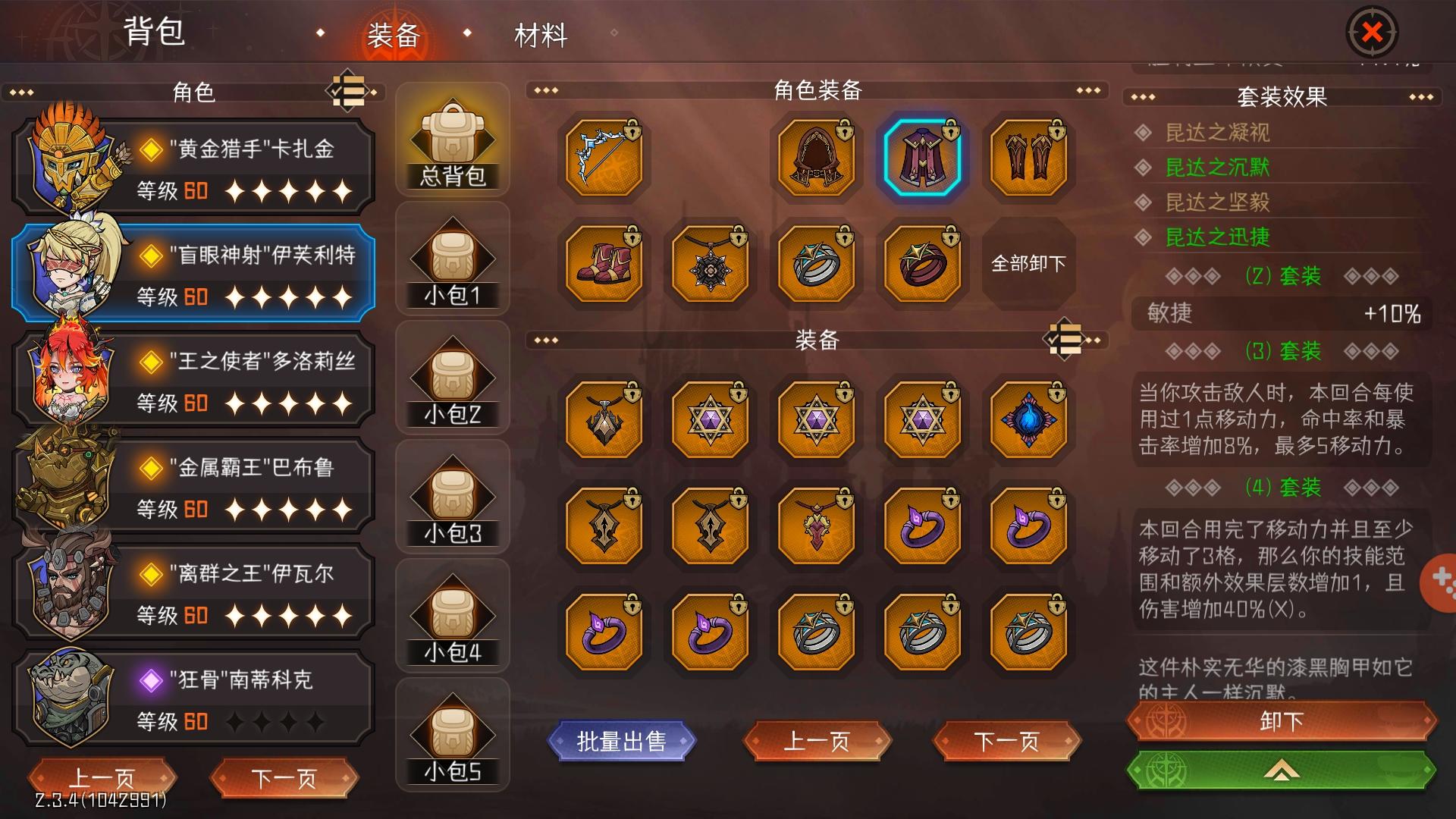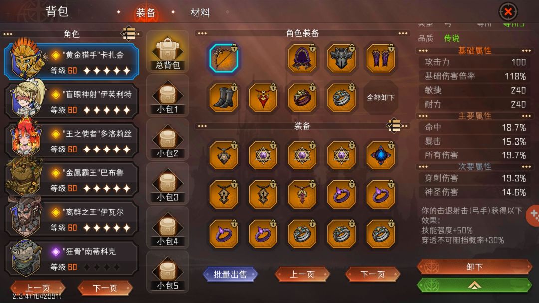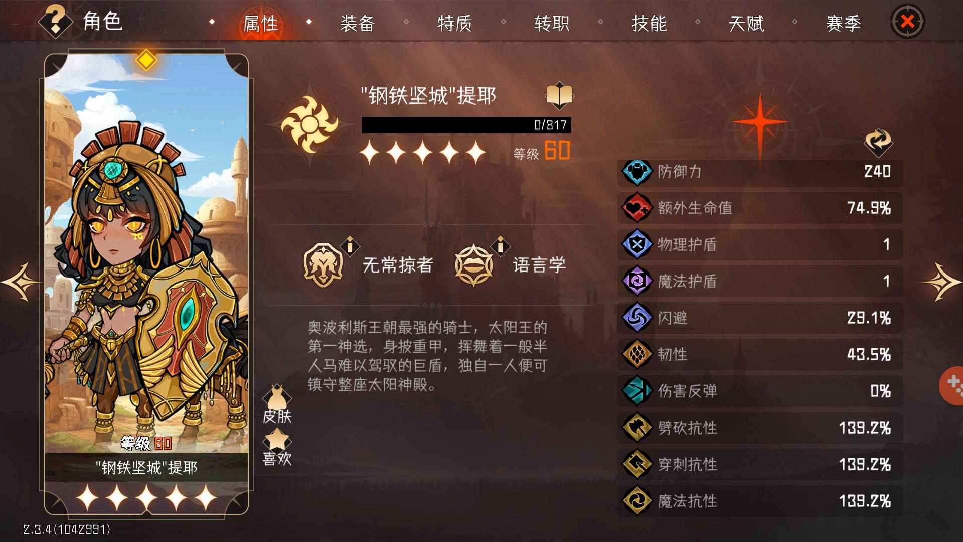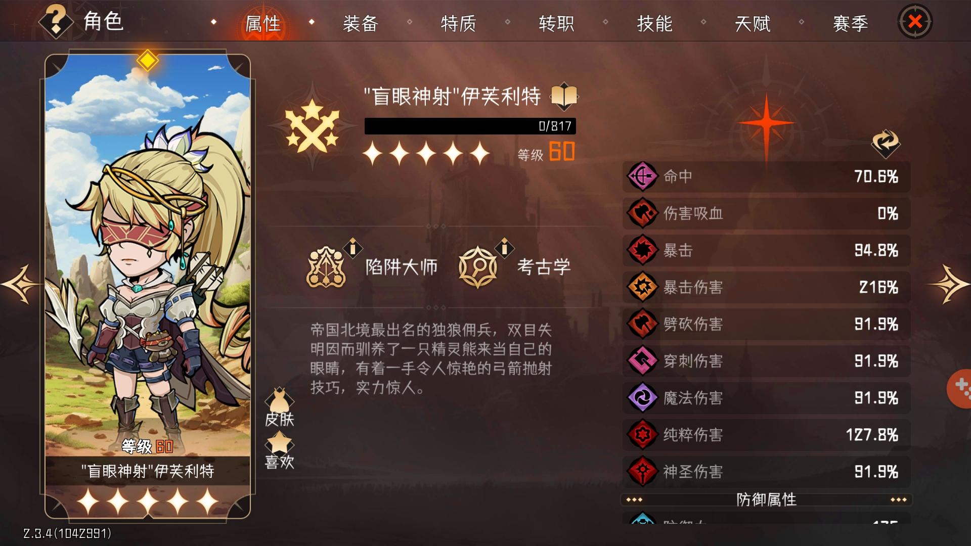 主T人马:骑士冲击专武、不动坚城护盾和飞升之石项链各额外加10防御(全军突击有不可阻挡词条因此不需要防控的盾),太阳骑兵套装提供移动力高额减伤外带骑士冲击金词条提供的移动力差减怪防御;再配五相宝珠圣物把防具主词条所有抗性洗到最高,其次韧性和闪避看情况,副词条在纯粹、魔法、劈砍、穿刺、神圣里挑一项数值最高洗成同属性,这一套下来150局内初始凹个征战神点个抗性成长基本就能抗下一切。技能词条:骑士冲击移动力差减2点防御>全军突击的冷却变为4回合>一切,流程上基本前面都是有啥团队加成的词条就点啥,真脸黑路上没出减防和减CD词条就在选完BOSS后那几关里抓紧刷一下。戒指赛季词条只选加命中的,武器、项链、戒指主词条只挑命中最高的要其余无视。骑士冲击减防御上限60配合力量祝福上限加40攻击即在当T的同时又能提供100点攻防差,且可以和黄金弓击退减防御叠加。黄金弓:击退射击专武和摧城项链(要的是这俩控制穿透),防具帝国圣物元素使+铁卫(元素使提供减20闪避和韧性,铁卫配合击退机制基础减防御、闪避总计提供减30闪避和55防御),究极核心词条:射手标记金色所有角色攻击技能有60%概率触发普攻配合陷阱弓的普攻和快速射击能让陷阱弓白嫖释放陷阱增加输出,其余词条优先击退射击的两个控制穿透和标记的减闪避和增伤词条剩下随缘,武器、戒指、项链也是只挑命中最高的就行,戒指赛季词条也是命中和控制穿透。黄金弓上限减100闪避、20韧性、55防御