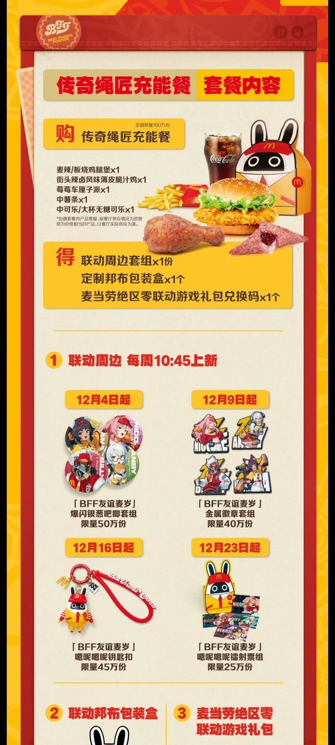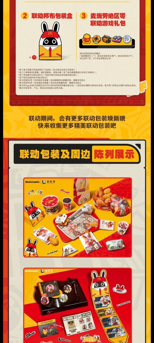 - 购买套餐可得联动周边套装×1份、定制邦布包装盒×1个、麦当劳绝区零联动游戏礼包兑换码×1个。