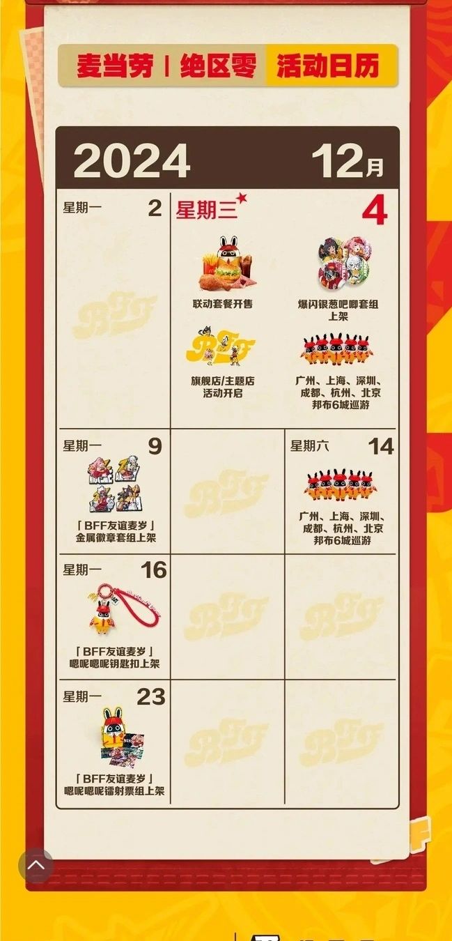 - 联动周边每周10:45上新,不同日期有不同限量周边上架,如12月4日起【BFF友谊麦岁】蹦蹦蹦徽章组限量50万份等。