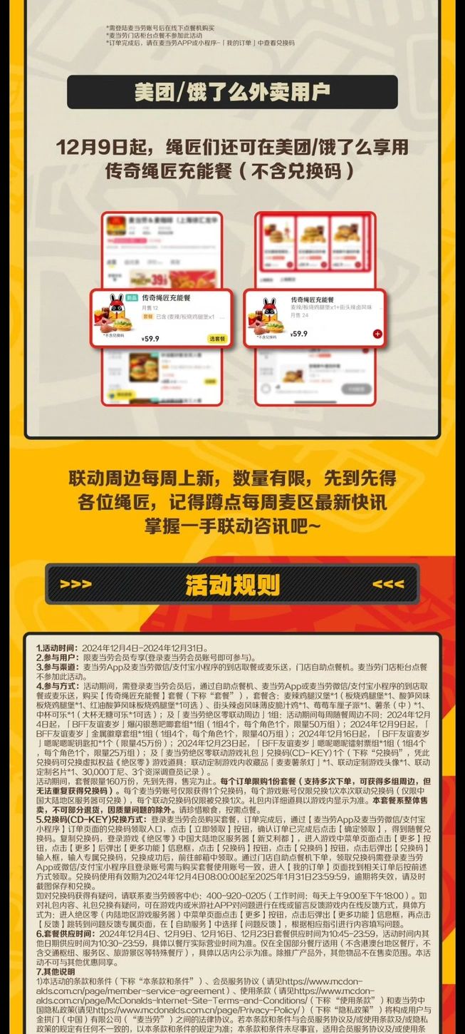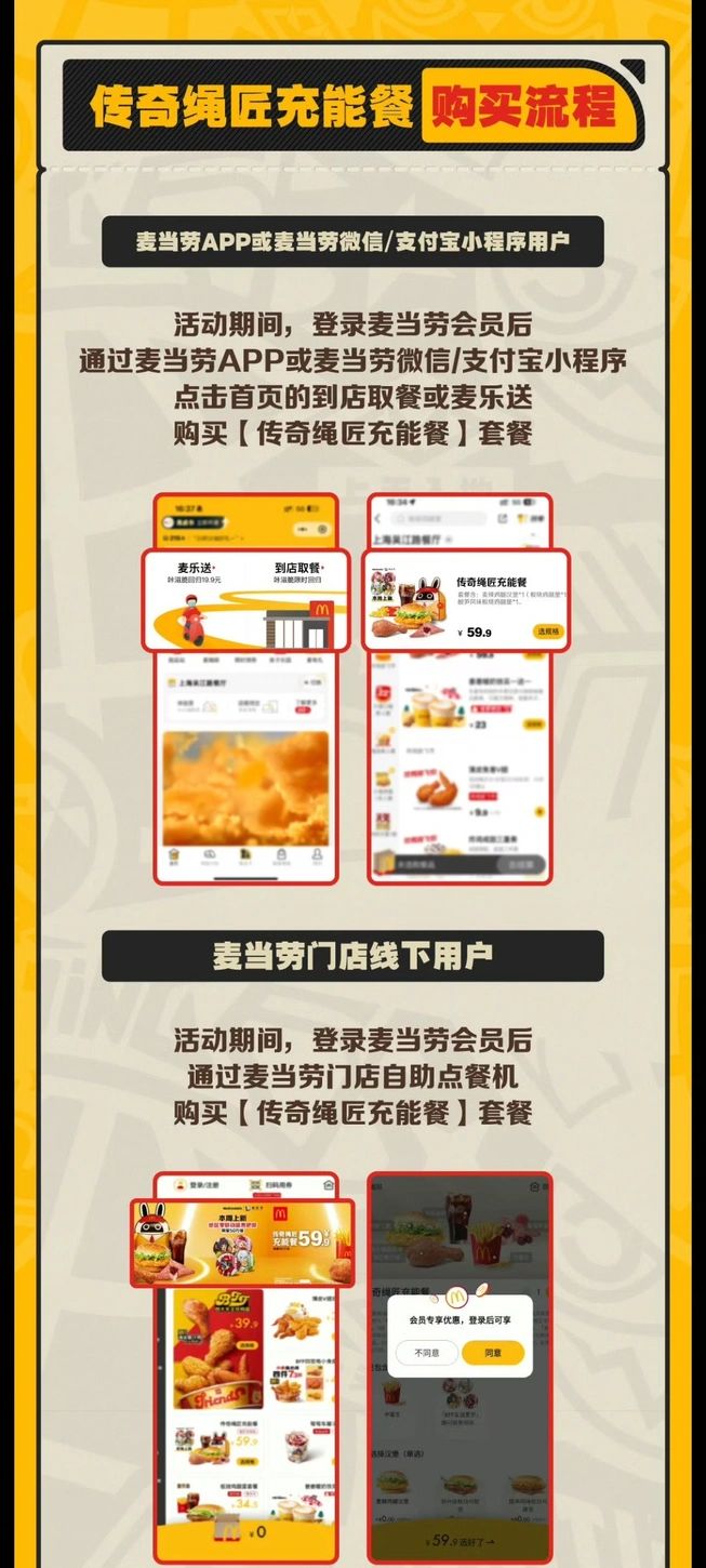 - 麦当劳门店线下用户:活动期间,登录麦当劳会员后,通过麦当劳门店自助点餐机可购买【传奇绳匠充能餐】套餐。