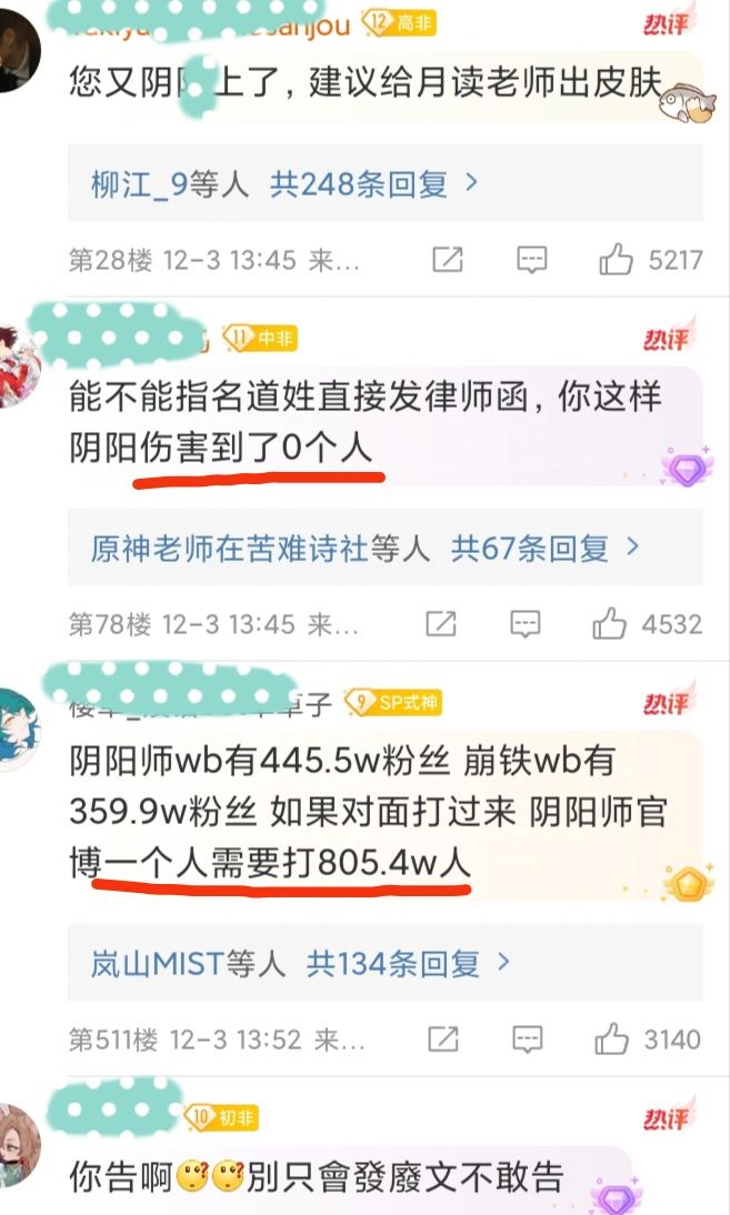 “阴阳师wb有445.5w粉丝 崩铁wb有359.9w粉丝 如果对面打过来 阴阳师官博一个人需要打805.4w人”