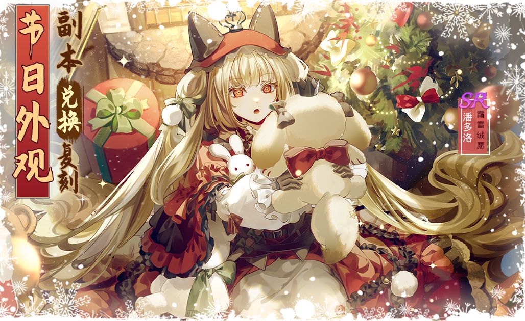 活动描述:活动期间,将开启复刻活动副本,御侍大人可收集道具,兑换SR飨灵潘多洛复刻圣诞外观-霜雪绒愿。