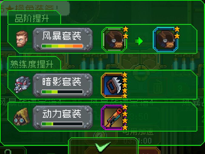 当获取到相同重复装备时, 会自动提升该装备自身的[升阶值], 当升阶值满值时可以对装备进行[升阶], 装备的基础属性会获得提升。